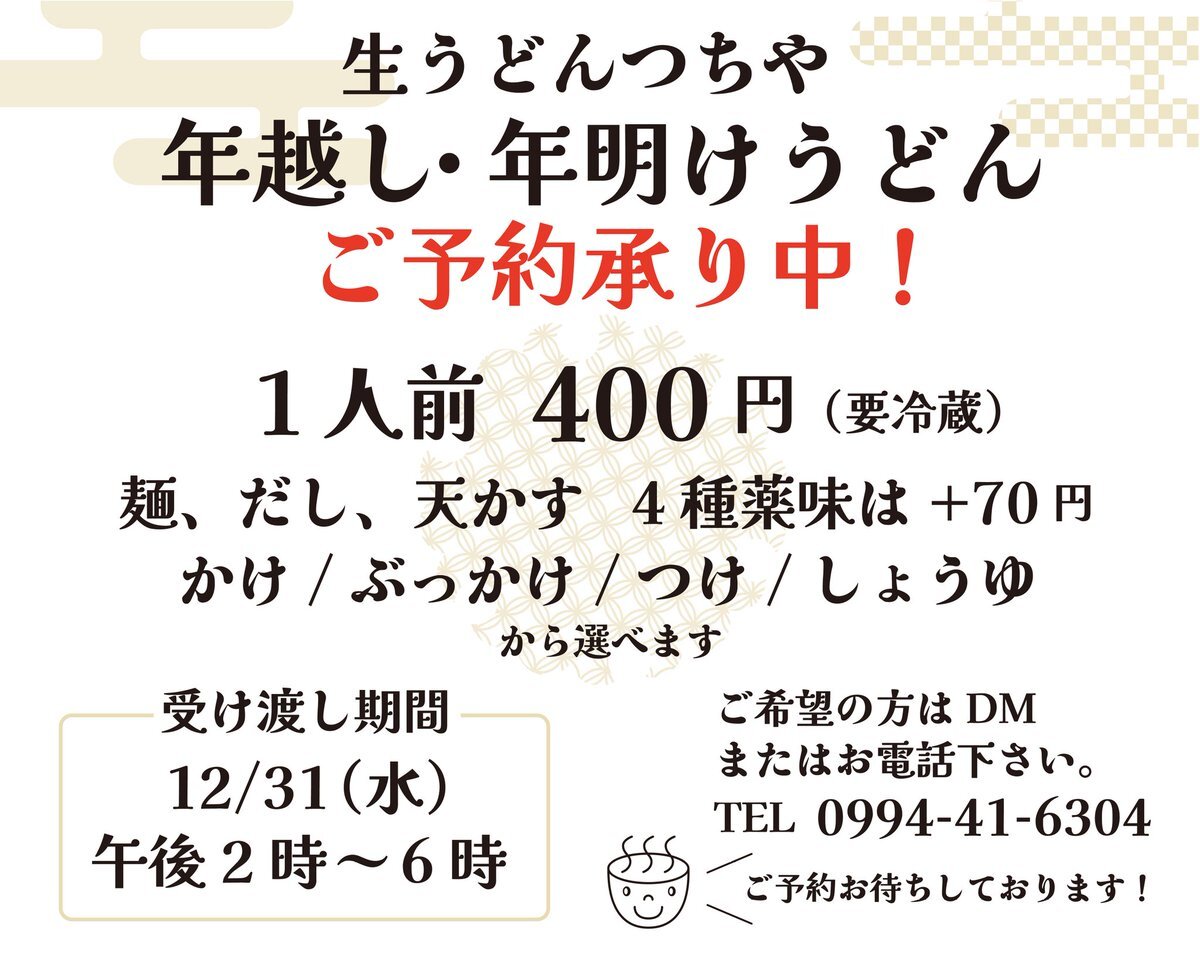 生うどんつちや今日12/17も14時30分までの営業でした。明日は定休日、明後日12/18は営業します。年越しうどんの予約も承り中です。【年末年始は(火)(木)元旦だけ休みます。】よろしくお願いします。鹿児島ランチ 生うどんつちや 鹿屋ランチ 鹿屋 #うどん #udon #天ぷら揚げたて だしは枕崎の鰹節を pic.x.com/OP2GaGgxRE