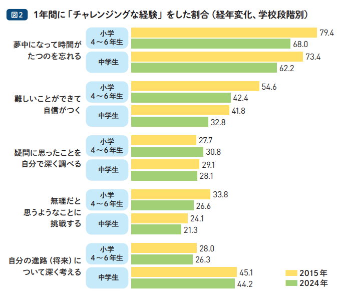 【チャレンジングな経験は減少傾向】 2015年から2024年の変化を見ると、「夢中になって時間がたつのを忘れる」経験や「難しいことができて自信がつく」経験が減少している。 view-next.benesse.jp/view_section/b… #チャレンジングな経験 #パネル調査 #VIEW next pic.x.com/a2avfcTHLL