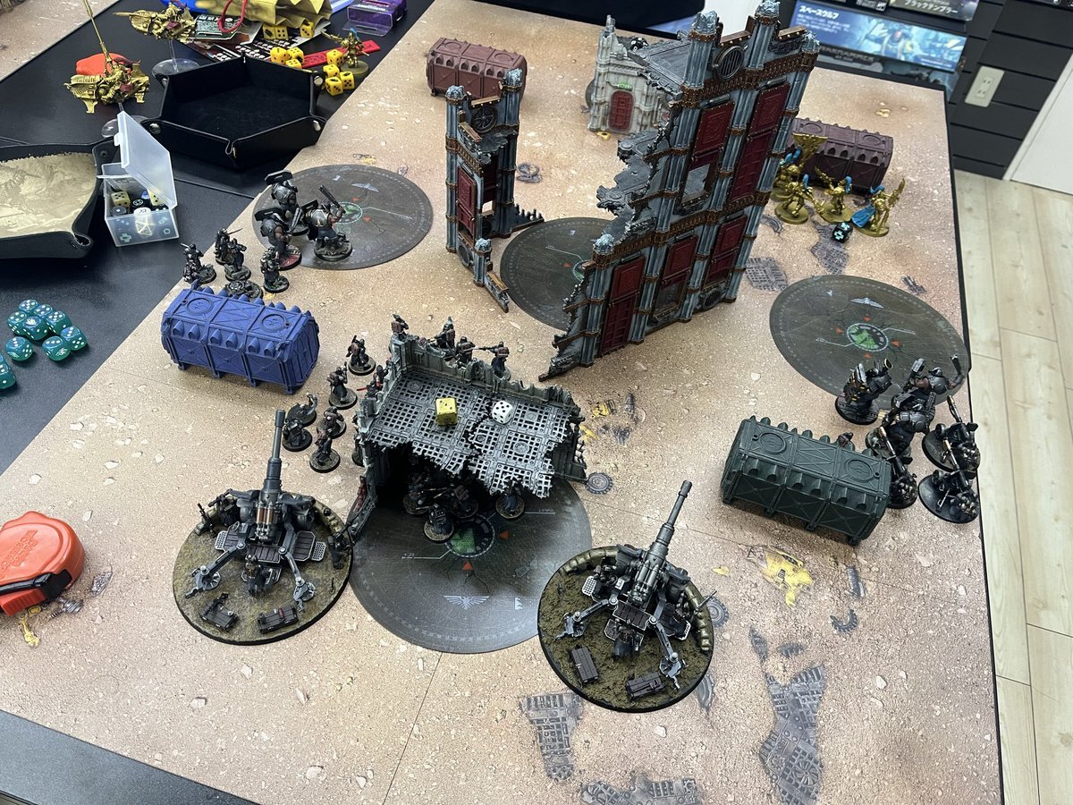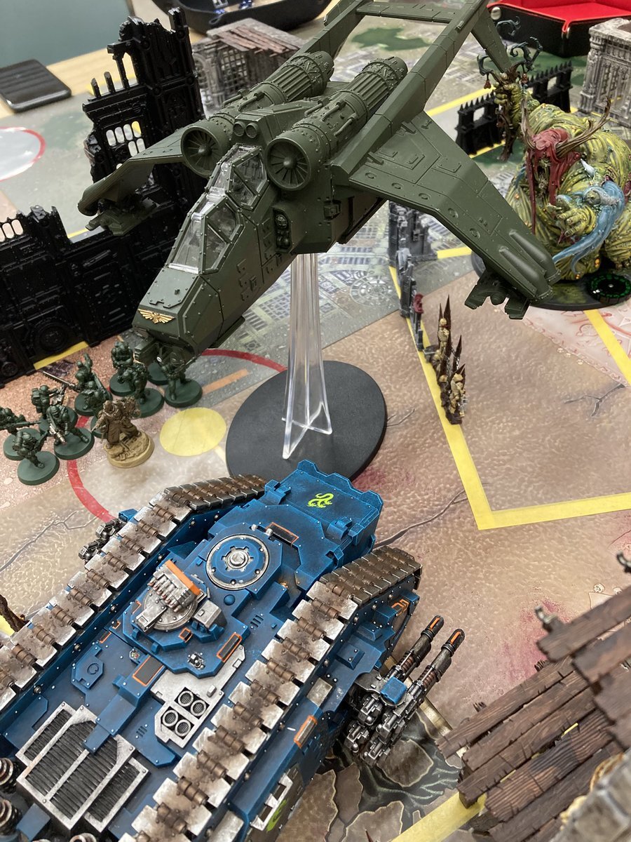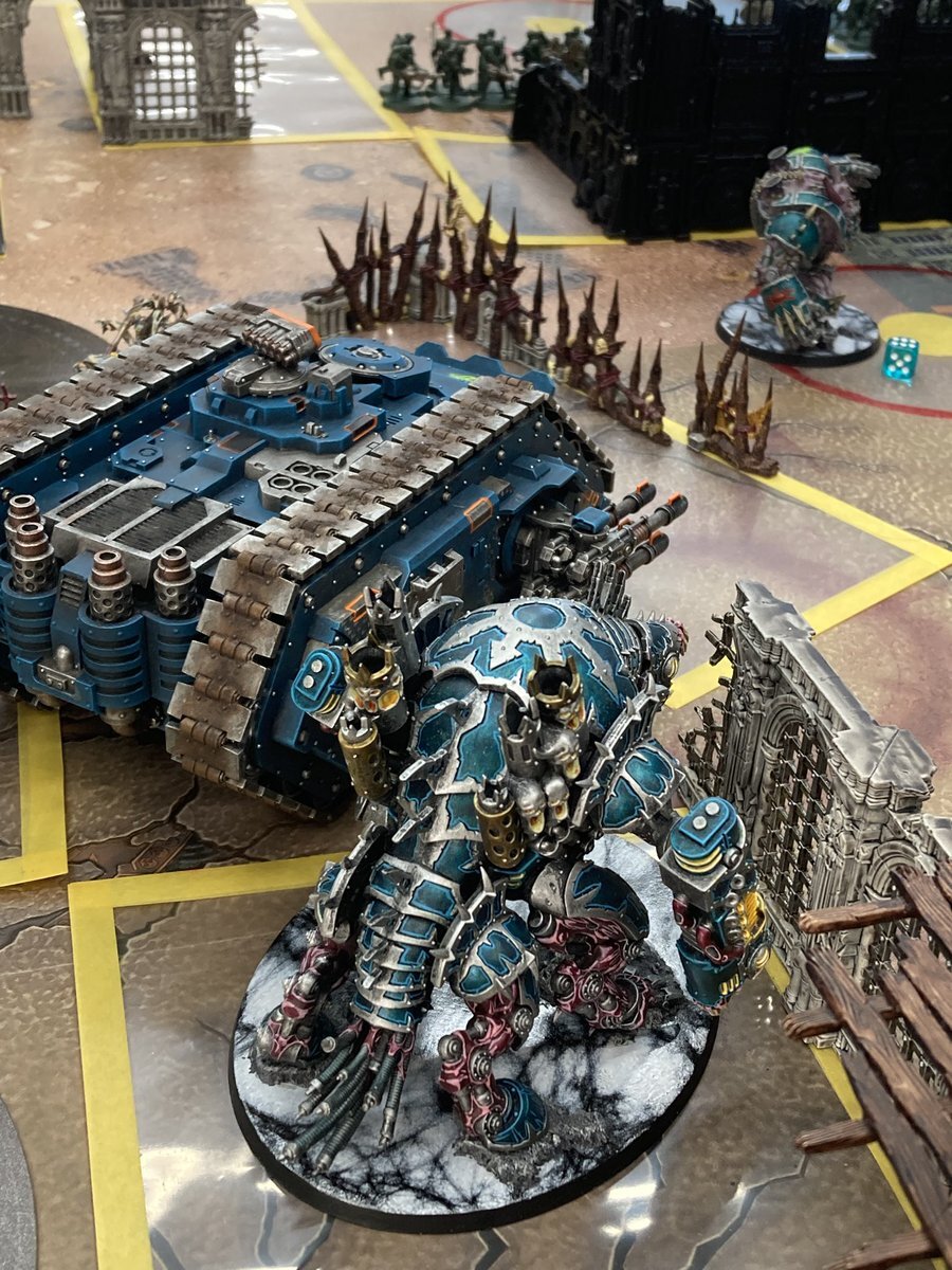 #ウォーハンマー #warhammer 久々の40kを3人打ち。 サウザンドサンの初戦。ケイオスナイトの先制射撃でサウザンドサン固有のユニットは半分以上消え、見知ったいつものビークルで戦った。難を逃れたツァーンゴールが確保&敵陣突撃で一番活躍していた。 大型ビークル同士が激突し見どころもあった。 pic.x.com/3g5q8gwY8A