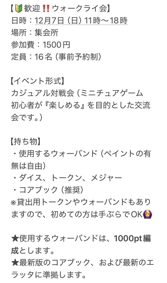 #仙川ドリム です。 ⚔️12月7日(日)11時〜 『ウォークライ会』を開催します。 ・🔰初心者大歓迎‼️ ・事前予約制にて受付中‼️ (DMでOK🙆♀️) ★オリジナルのフィールドで戦いませんか? 詳細は添付画像をご確認ください。 皆様のご来店をお待ちしてます😊 #ウォークライ #warhammer #ウォーハンマー pic.x.com/glidTi6xhd