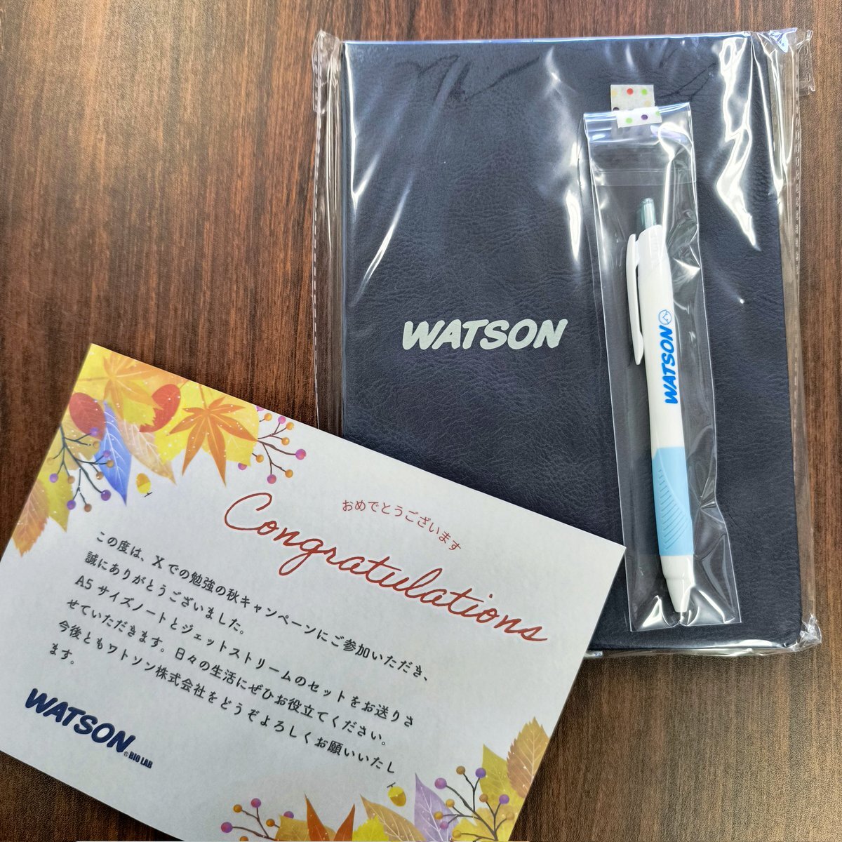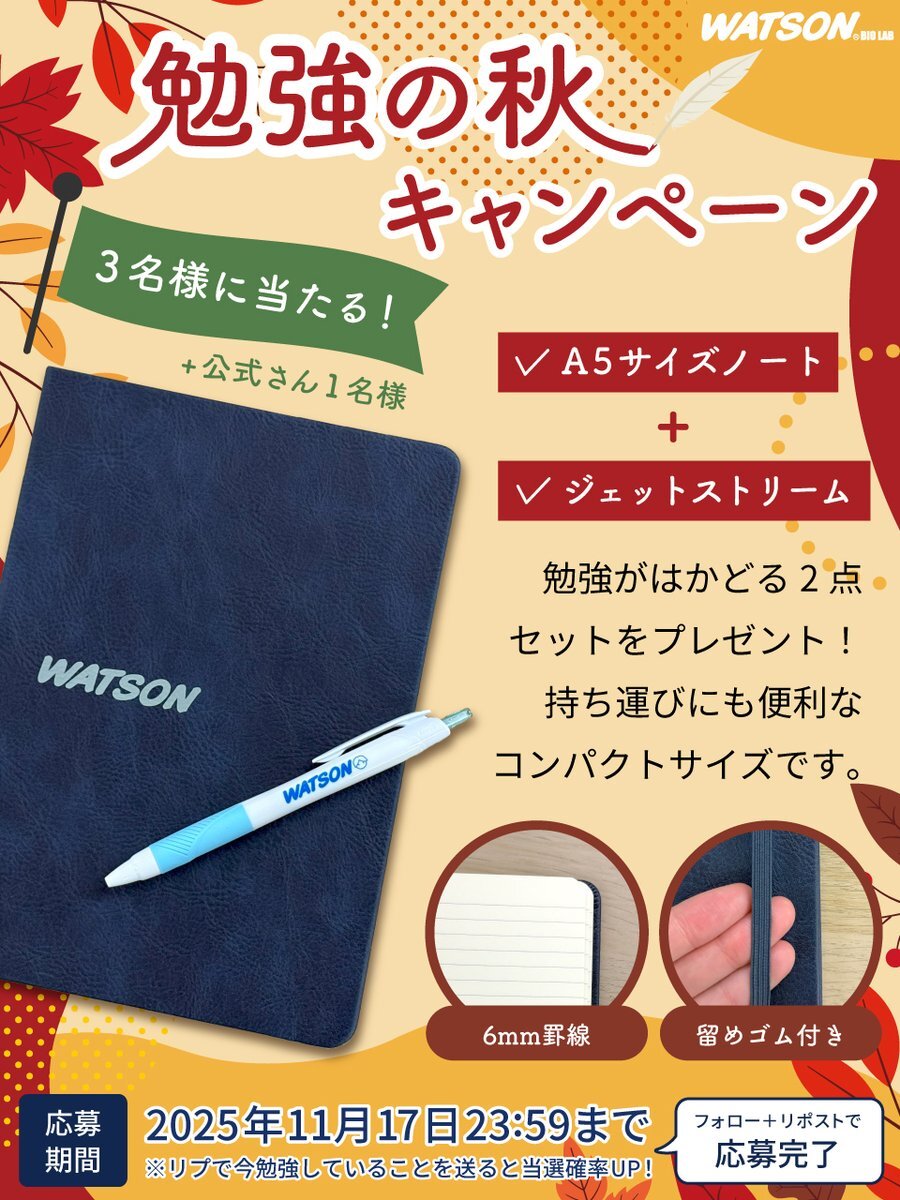 勉強の秋キャンペーン🍁🖊 【ワトソンロゴ入り】 ・ボールペン(0.5mm) ・ハードカバーA5ノート 持ってるだけでかっこいいノートと、大人気のジェットストリームがセットです✨ 🟦応募方法 ①このアカウント @WATSON_JAPAN をフォロー ②このツイートをRP 🟦応募期間 2025年11月17日23:59まで