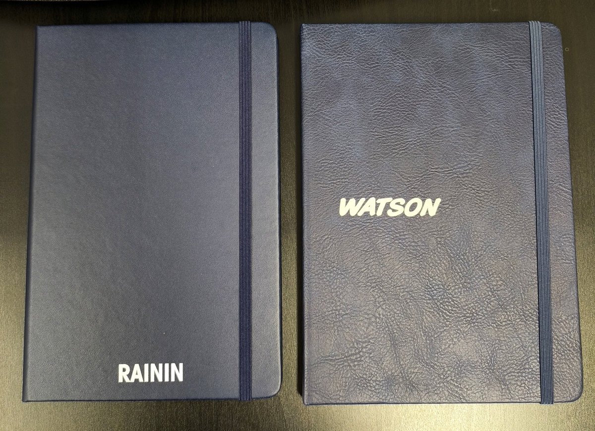 本日届いた #WATSON さんのノート、先日頂いた #RAININ さんのと双子?と思ったら、ちょっとだけワトソンさんのがお兄ちゃんだった。縦に数ミリ横は1センチくらい大きい。で、皺(皮テイスト強め)がある(笑) 中の紙質、色や罫線はおんなじ感じ。 pic.x.com/oPNd9QNiPL
