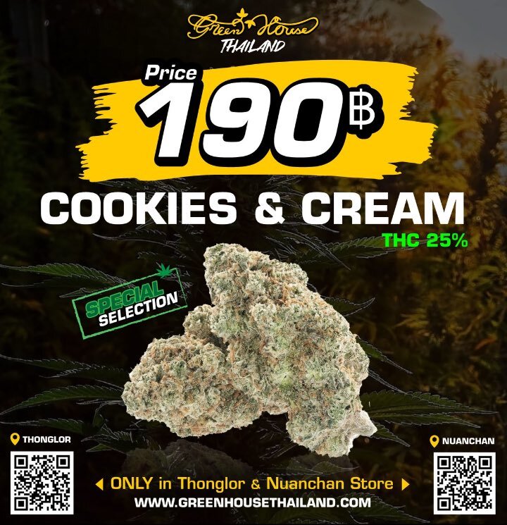 greenhouse🇹🇭 オンライン予約すると 190bahtで COOKLES &CREAM 手に入れられるみたいだよ〜✨✨ トンロー店orヌアンチャン店のみらしい 🇹🇭にいる人い〜な〜😆 #タイ #cannabis #weed #大麻 #grow #greenhouse pic.x.com/PdlLmA1q7v