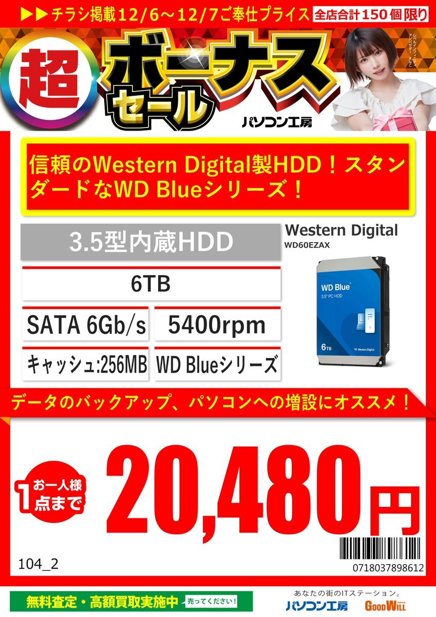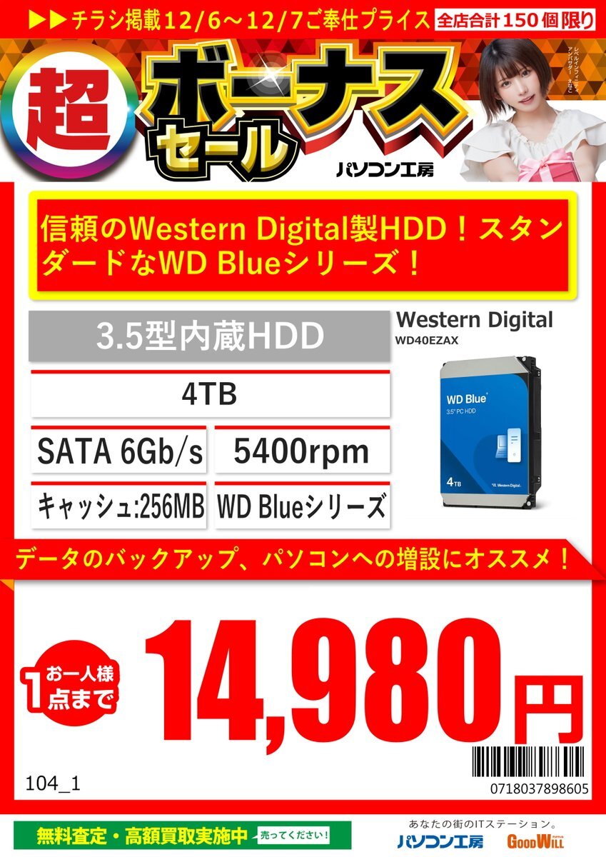 【土日限定セール品情報】 12/6、12/7 土日限定PCパーツセール! #WesternDigital 製3.5インチHDD 4TB「WD40EZAX」税込14,980円 6TB「WD60EZAX」税込20,480円 8TB「WD80EAAZ」税込22,980円 #パソコン工房  #千葉 pic.x.com/inBF5K3rhS