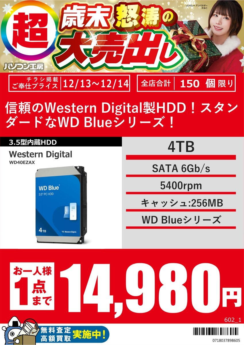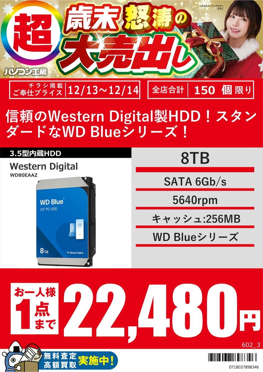 12/13,12/14土日限定ご奉仕プライス! #WesternDigital 製3.5インチHDD 4TB「WD40EZAX」税込14,980円 6TB「WD60EZAX」税込20,480円 8TB「WD80EAAZ」税込22,480円 pic.x.com/cR5Kiz6wEl