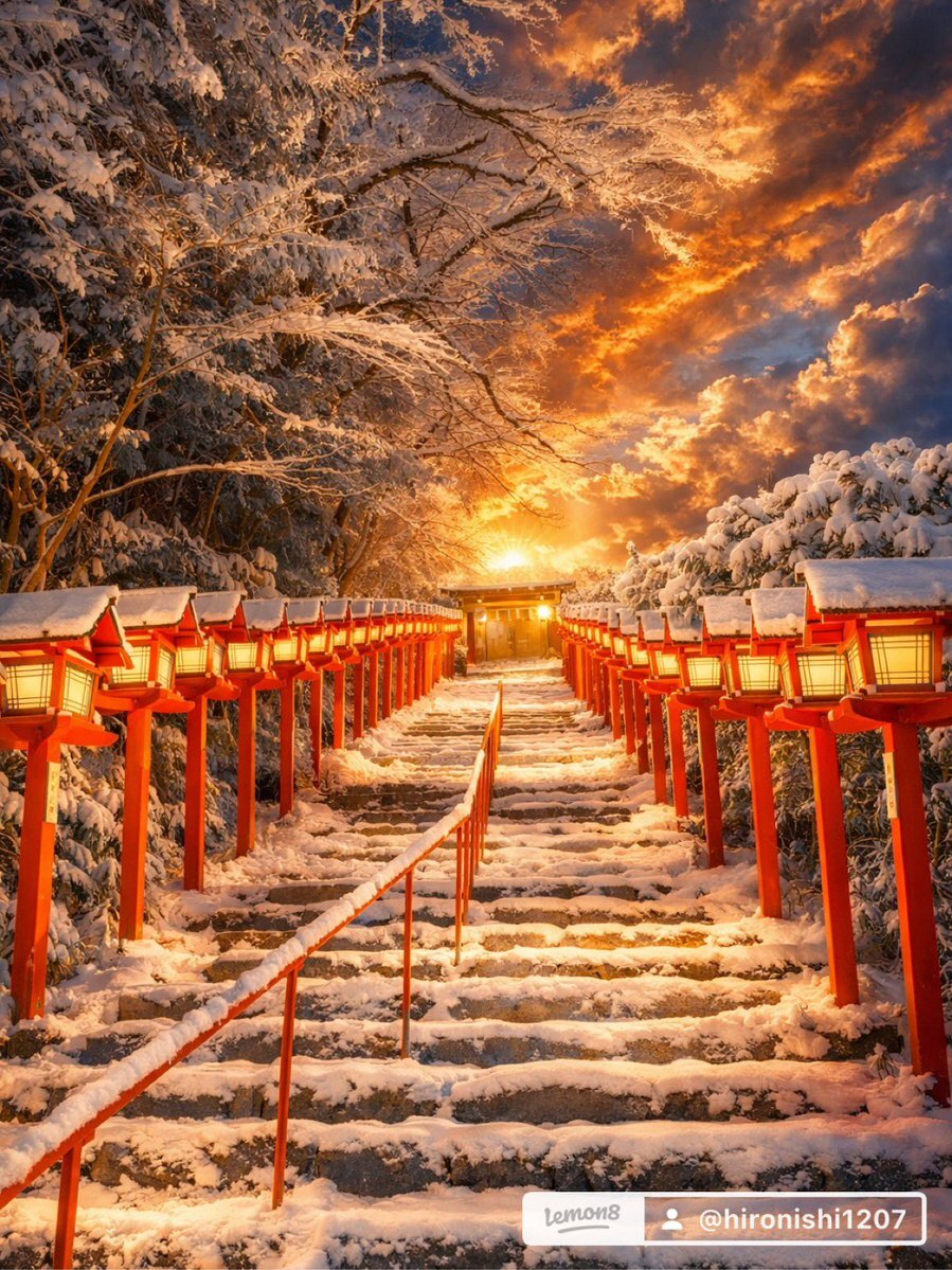Snowy shrine steps with glowing lanterns. ❄️⛩️ 朱の灯りが雪に映えて、空は燃える朝焼け。Quiet, warm, unreal. #Japan #winter #cinematic #AIart pic.x.com/YbnD1pR7Ov