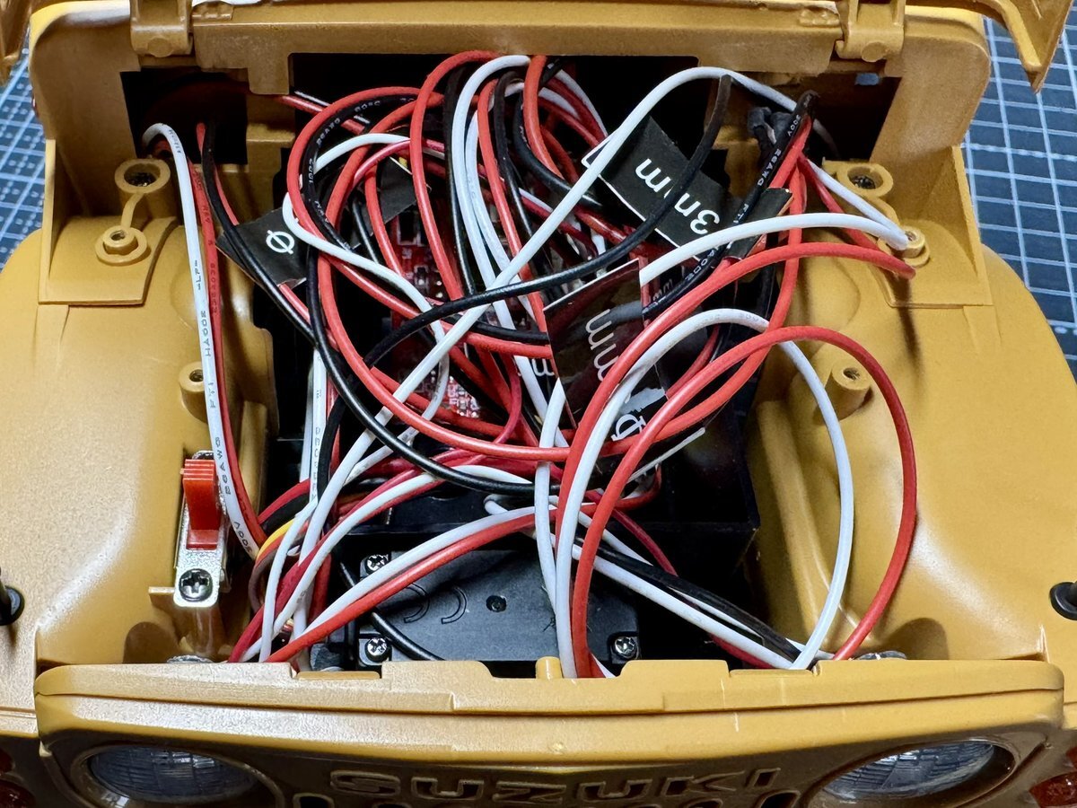 テールランプの配線はテールカバー→フレーム→サイドアンダーカバーを通りエンジンルームへ。一見スッキリしてますが、線が少々はみ出てるのでフレームを加工した方が良さそう… 余計な線も入ってる事もありエンジンルームはギチギチに。 (2/2) #WPL #C84 #ジムニー #SJ10 pic.x.com/Pq7CIgM9t3