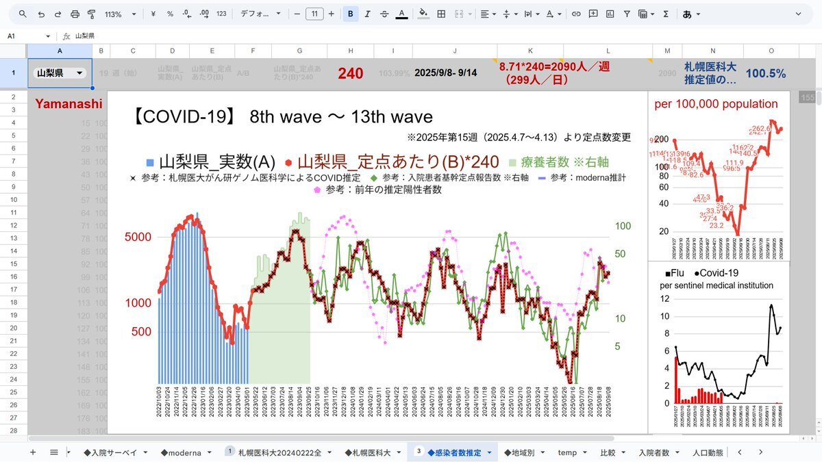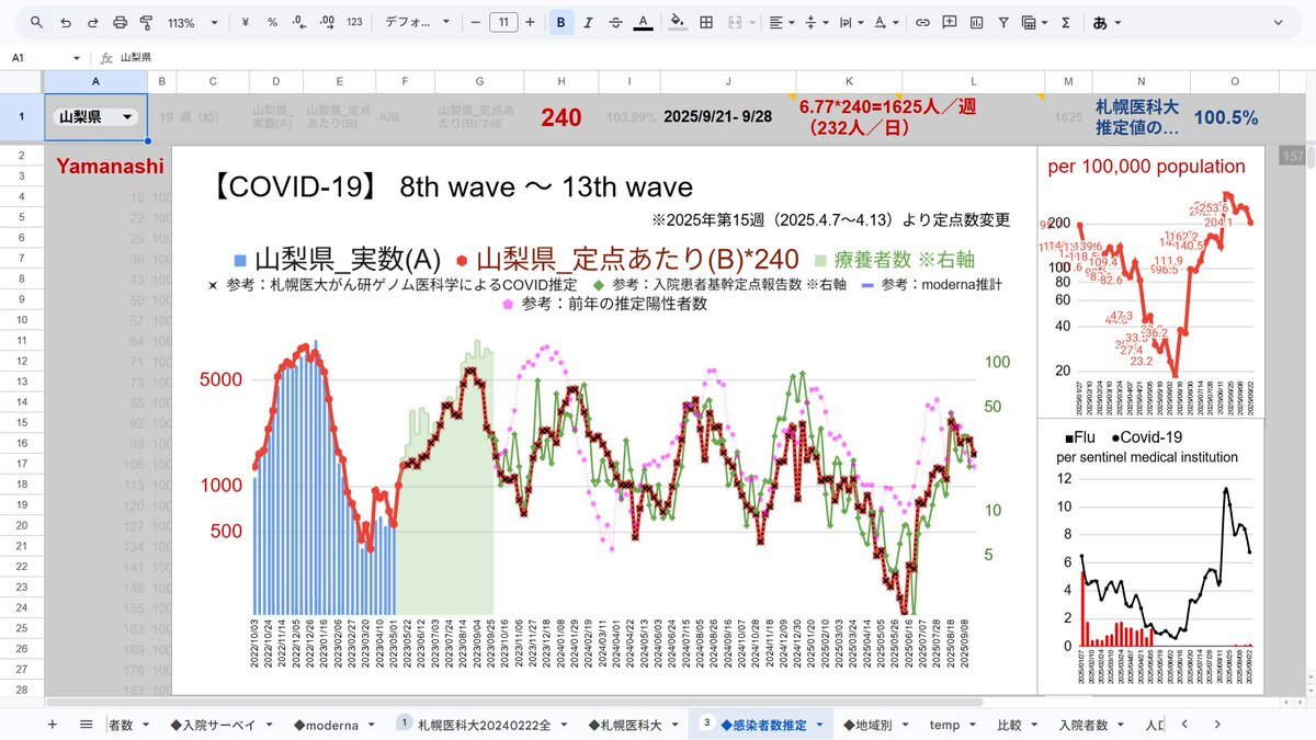 No.19【山梨県】 #Yamanashi pref. 2025/9/8- 9/14 新型コロナ 推定新規陽性者数 目安は定点あたりの240倍 8.71*240=2090人/週 (299人/日)前週比 108.5% ★注意:10万人あたり 263人/週 ※札幌医科大推定 2079人/週 赤紫の点線は前年です #COVID_19 pic.x.com/ktggAwA0RU