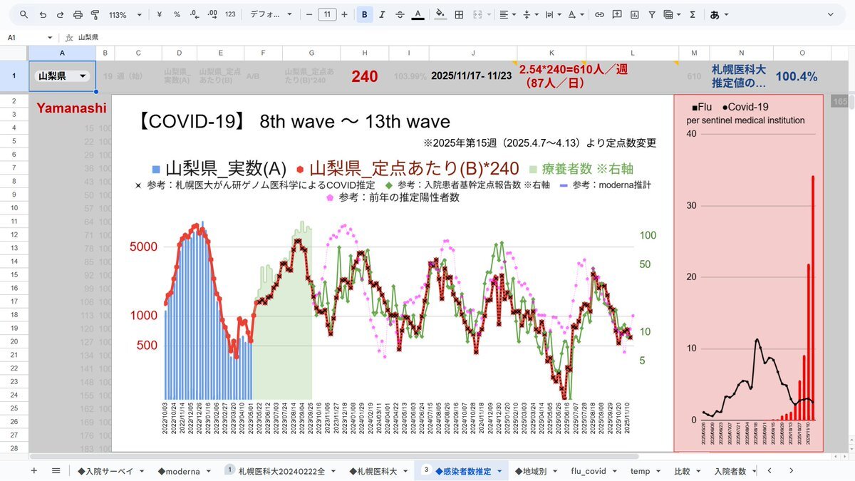 No.19【山梨県】 #Yamanashi pref. 2025/11/17- 11/23 新型コロナ 推定新規陽性者数 目安は定点あたりの240倍 2.54*240=610人/週 (87人/日)前週比 83.8% ☆:10万人あたり 77人/週 ※札幌医科大推定 607人/週 赤紫の点線は前年です ※インフルエンザのグラフを拡大してお届けします #COVID_19 pic.x.com/C6tdfwsg89