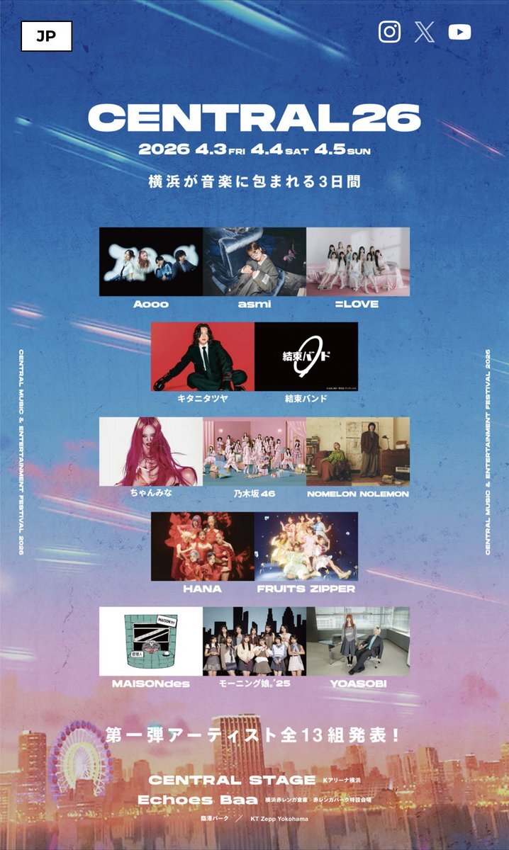 zmedia.jp/entertainment/… 【CENTRAL 2026】開催決定、第1弾アーティストにイコラブ/ちゃんみな/HANA/YOASOBIら … また、第一弾アーティストとして、Aooo、asmi、=LOVE、キタニタツヤ、結束バンド、ちゃん … #YOASOBI