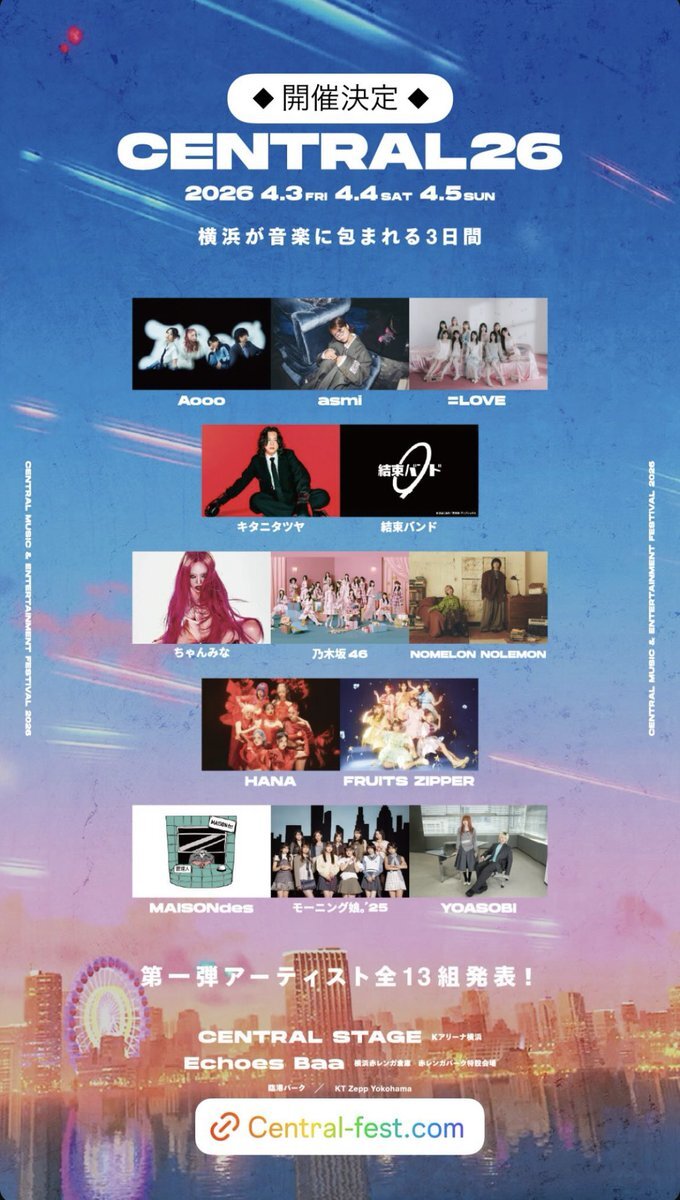 ◆ 開催決定 ◆ CENTRAL MUSIC & ENTERTAINMENT FESTIVAL 2026 2026年4月3日(金)・4日(土)・5日(日)横浜で開催 ▼公式HP central-fest.com ▼第一弾出演アーティスト Aooo @Aooo_band asmi @asmi__official =LOVE @Equal_LOVE_12 キタニタツヤ @TatsuyaKitani 結束バンド @BTR_anime