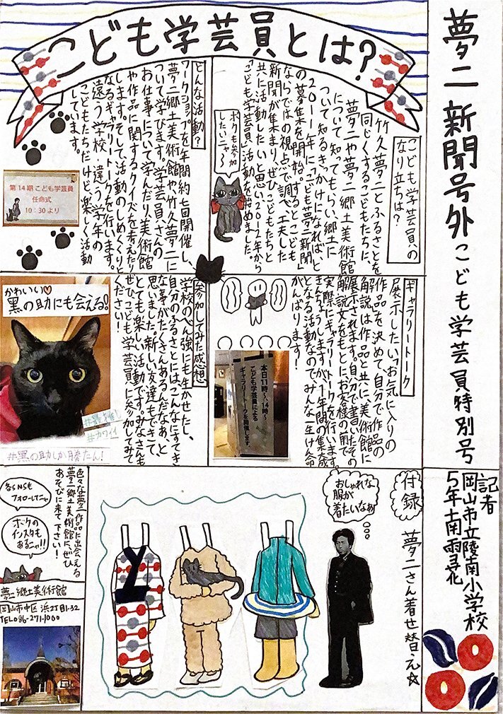 第15回「こども夢二新聞」受賞作品を順次ご紹介します! 黑の助賞に輝いたのはこちらの作品!🐈⬛ 審査には黑の助も参加しました。 🌟南雪花さん 受賞作品は現在夢二郷土美術館本館で展示中です✨ #岡山 #美術館 #新聞 #夢二 #こども #壁新聞 #yumejiartmuseum #yumeji #newspaper #children #okayama pic.x.com/j7qJbxAuNj
