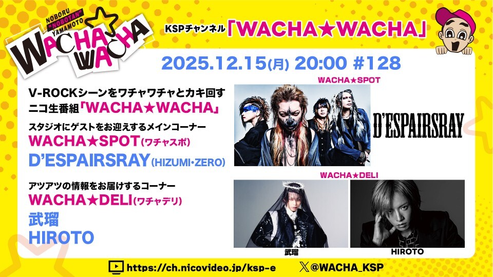 明日12/15(月)20時~スタジオにD'ESPAIRSRAY(#HIZUMI #ZERO)を迎えて #ワチャワチャ します🤗 タイムシフトをお忘れなく✅ #武瑠 #HIROTO のコメントもcheck✨ 💟視聴ページ▹▸sp.live.nicovideo.jp/watch/lv349356… 💟D'ESPAIRSRAYへの質問▹▸docs.google.com/forms/d/e/1FAI… #DESPAIRSRAY pic.x.com/XsN48cLM0W x.com/WACHA_KSP/stat…