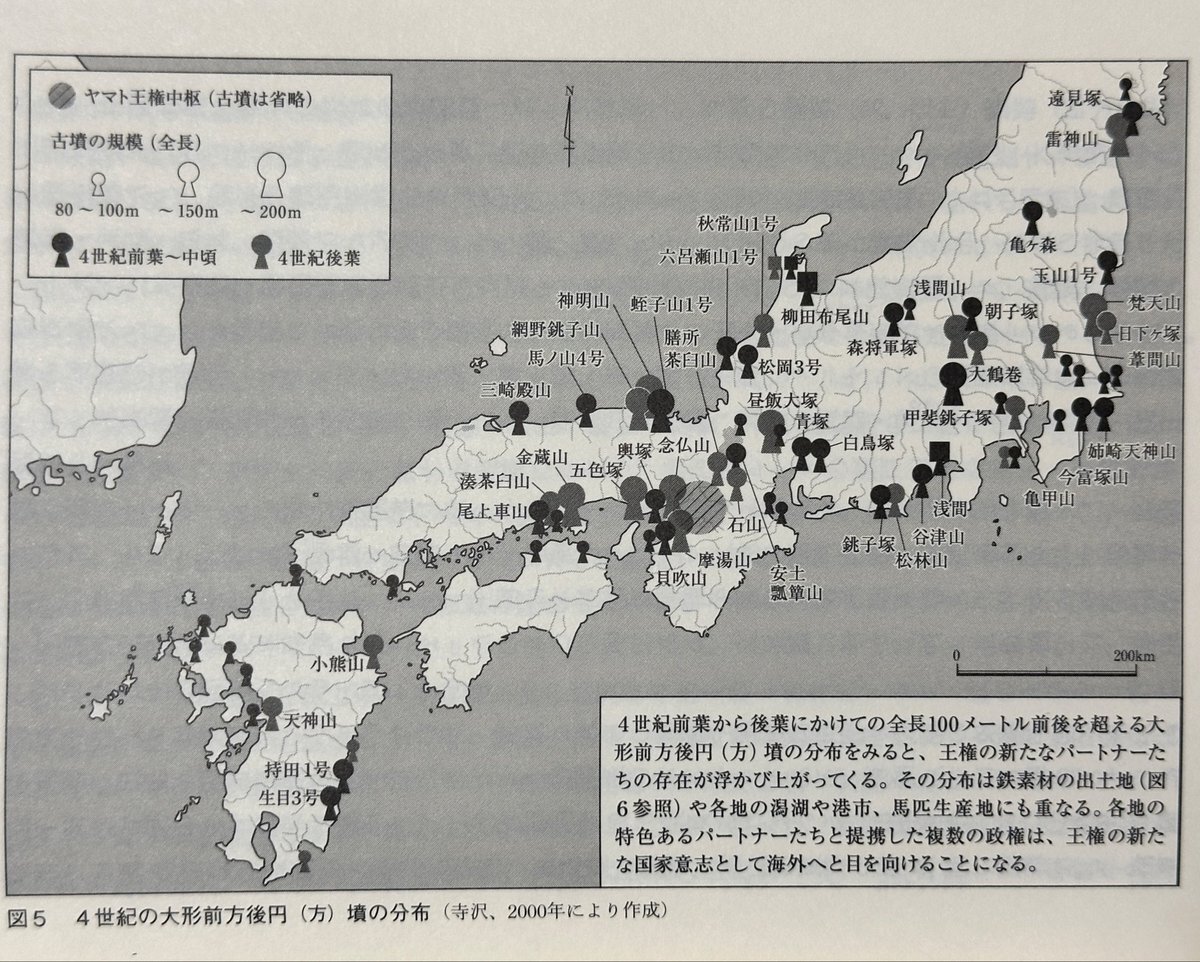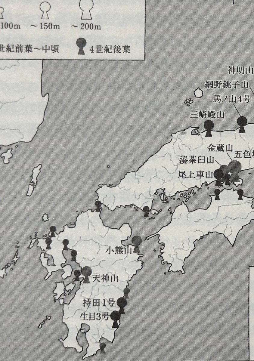 以下、寺沢薫先生の著書に掲載されている、4世紀の巨大な前方後円墳の分布図。逆に巨大前方後円墳のない地域はヤマト王権の力があまり及んでなかったのかな?も思ったりする。能登や駿河湾の前方後"方"墳の地域も同様に。 pic.x.com/vTVRU4IwP1