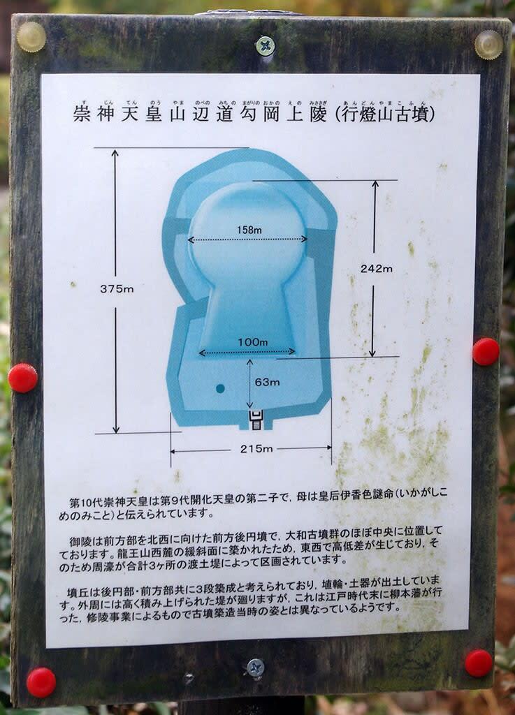 見て得た所見だが、前方後円墳には前方部が長いタイプ(ウワナベ古墳など)と前方部が短いタイプ(コナベ古墳など)があるようで、このあたりは築造企画論で検討されていたはずである。 今、手元に資料がないので、行燈山古墳の墳丘長などの数値は天理市観光協会のホームページを参考にした。