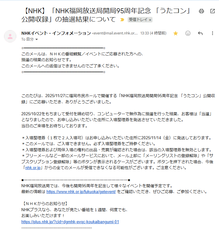 福岡の「うたコン」公開収録の抽選に当選しました! なんか今年は妙にイベント運がいいような気がします。 Xでは落選のポストが多かったので、すごい倍率だったのかな。そんな中、私を選んでくれたコンピューターに、ありがとう。 私の1番のお目当ては、森高千里さん。どの曲を歌ってくれるんだろう。 pic.x.com/q0L7HfIxuP