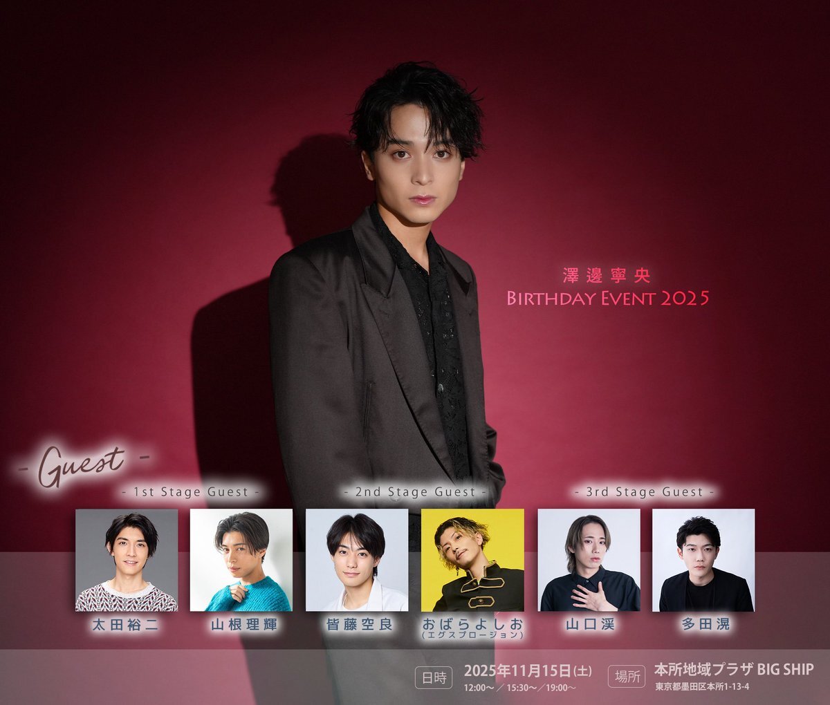 澤邊寧央Birthday Event 2025 11/15(土)12:00〜/15:30〜/19:00〜 @本所地域プラザBIGSHIP 【ゲスト様発表!】 1部:太田裕二、山根理輝 2部:皆藤空良、おばらよしお 3部:山口渓、多田滉 【一般販売のご案内】 10/17(金)22:00〜開始! confetti-web.com/@/neo_birthday… ご来場を心よりお待ちしております!