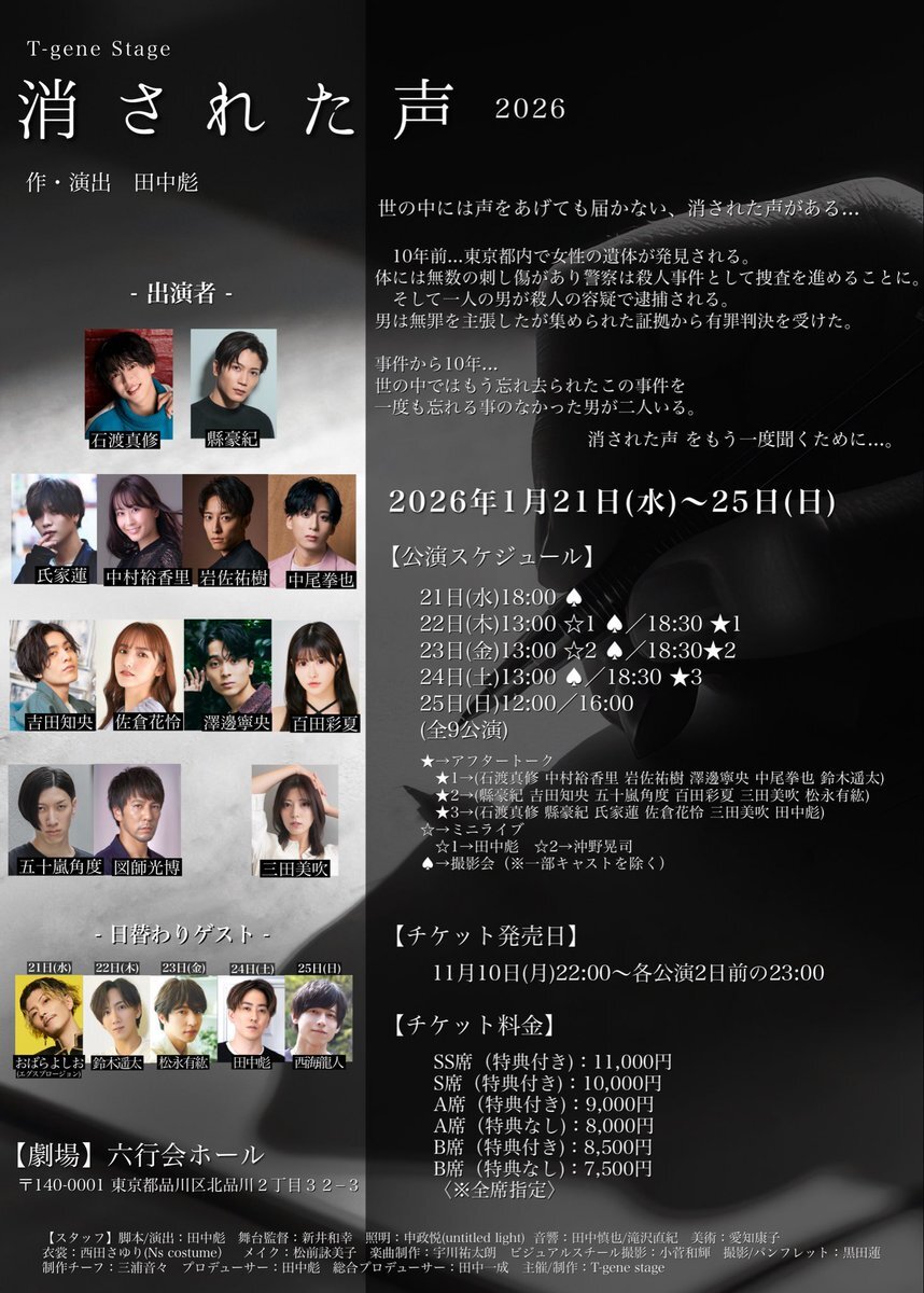 #消さ声 ◤日替わりゲスト◢ 松永有紘 おばらよしお(エグスプロージョン) 鈴木遥太 西海龍人 田中彪 ※出演日は後日発表いたします。 ━━━━━━━━━━━━━━━━ T-gene Stage 「消された声 -2026-」 2026年1月21日(水)〜25日(日) 六行会ホール