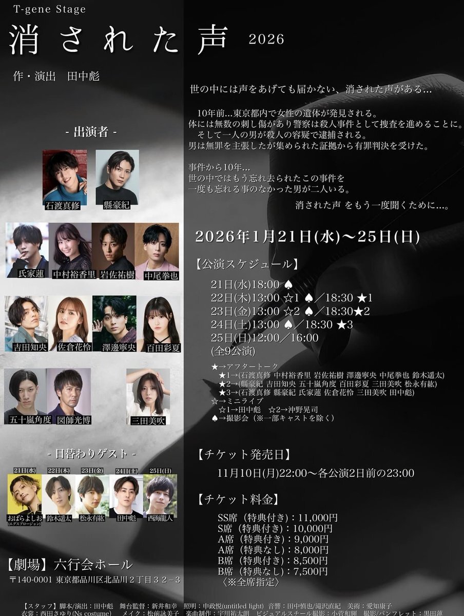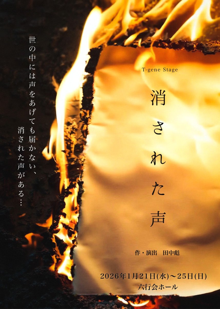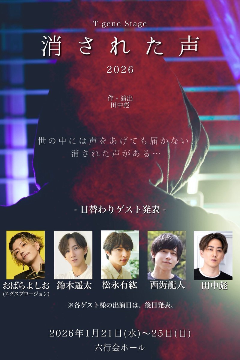#消さ声 ◤日替わりゲスト◢ 松永有紘 おばらよしお(エグスプロージョン) 鈴木遥太 西海龍人 田中彪 ※出演日は後日発表いたします。 ━━━━━━━━━━━━━━━━ T-gene Stage 「消された声 -2026-」 2026年1月21日(水)〜25日(日) 六行会ホール pic.x.com/oouDmMwUU7