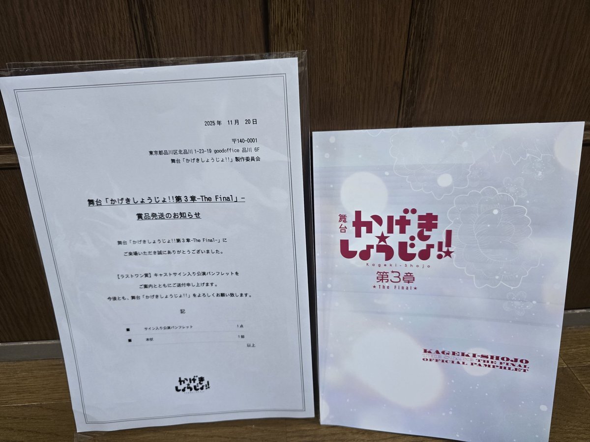 舞台「かげきしょうじょ!!」第3章 The Final 公演オリジナルくじのラストワン賞の 全キャストサイン入りパンフレットが遂に手元に届きました✨ 最後の最後に思い出に残る素敵な物をいただけて嬉しいです🥹 大切にします! (一部チラ見せ…初風さんのもあった!) #舞台かげき #かげきファイナル pic.x.com/n5kc8wcBfo