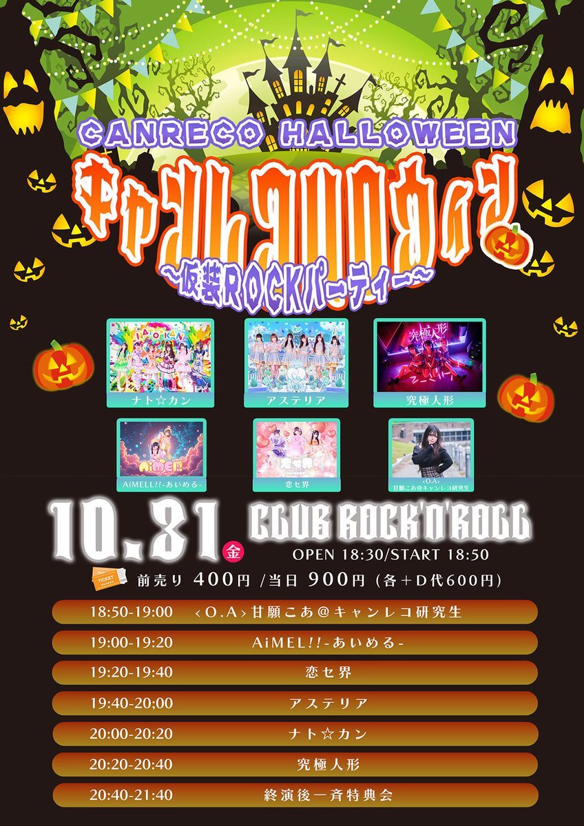 10月31日(金) キャンレコハロウィン🎃👻 〜仮装ROCKパーティー〜 🕐OPEN 18:30/START 18:50 📍新栄CLUB ROCK'N'ROLL 🎫前売り400円 /当日900円 (各+D代600円) ※ハロウィンコスプレライブ! 🎫チケット t.livepocket.jp/e/hxbex 当日会場にて ハロウィンコスプレの デコチェキを数量限定で販売