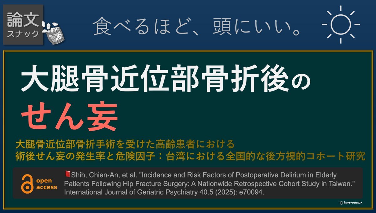 📖大腿骨近位部骨折後(HFs)のせん妄 ・118,682人のHFs者(≧65歳) 🔹せん妄発生率:1,000人年当たり1.87件 🔹危険因子  ├ 女性(HR 0.59)  ├ 95歳以上 (3.52)  ├ 合併症としての認知症(2.63)  └ ICU滞在日数2–3日(2.85) 🔹せん妄発生は死亡リスクと関連+ 思ったよりも少ない発生率ですね😲 pic.x.com/JbltWuTlg8