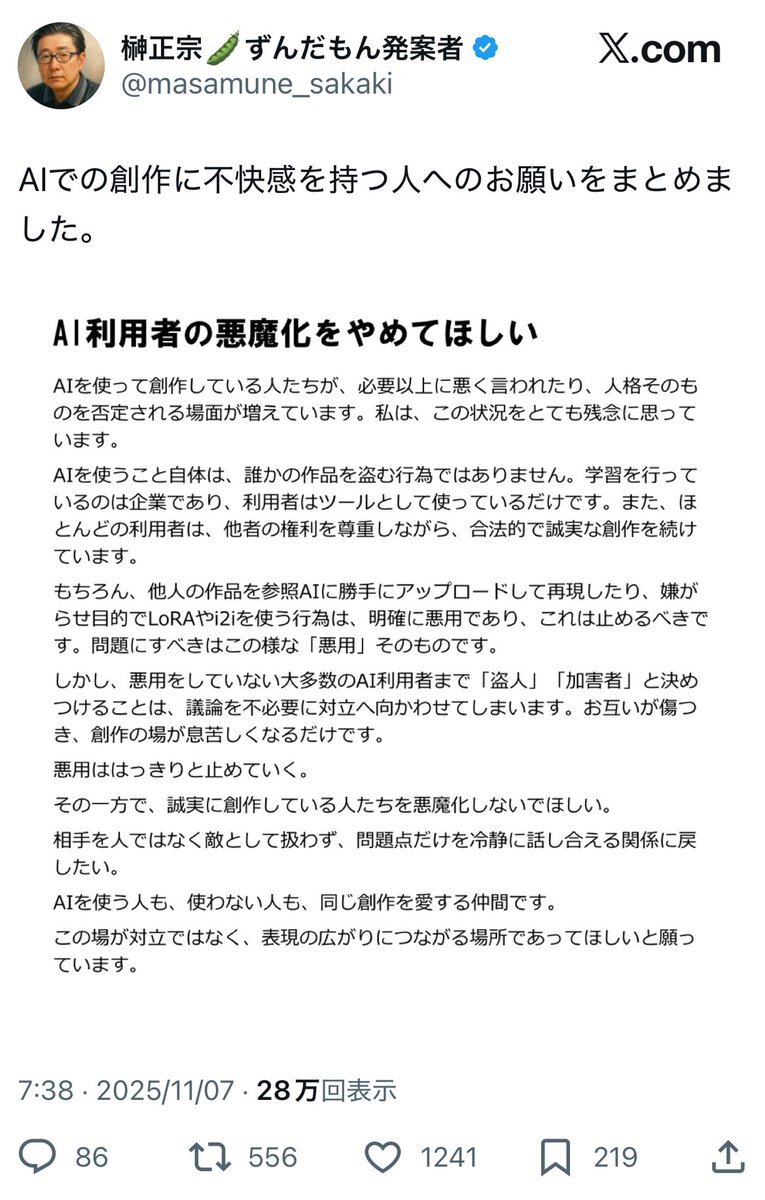 悪魔化って何言ってるんだ 悪用しといての自己正当化か 生成AIの学習しているのは企業だから企業に責任転嫁しようとしているけど、問題があるものと認識して使っているのは君達なんだから、使った人の責任が問わてるのは当たり前じゃないか 後生成AIは創作ではないよ