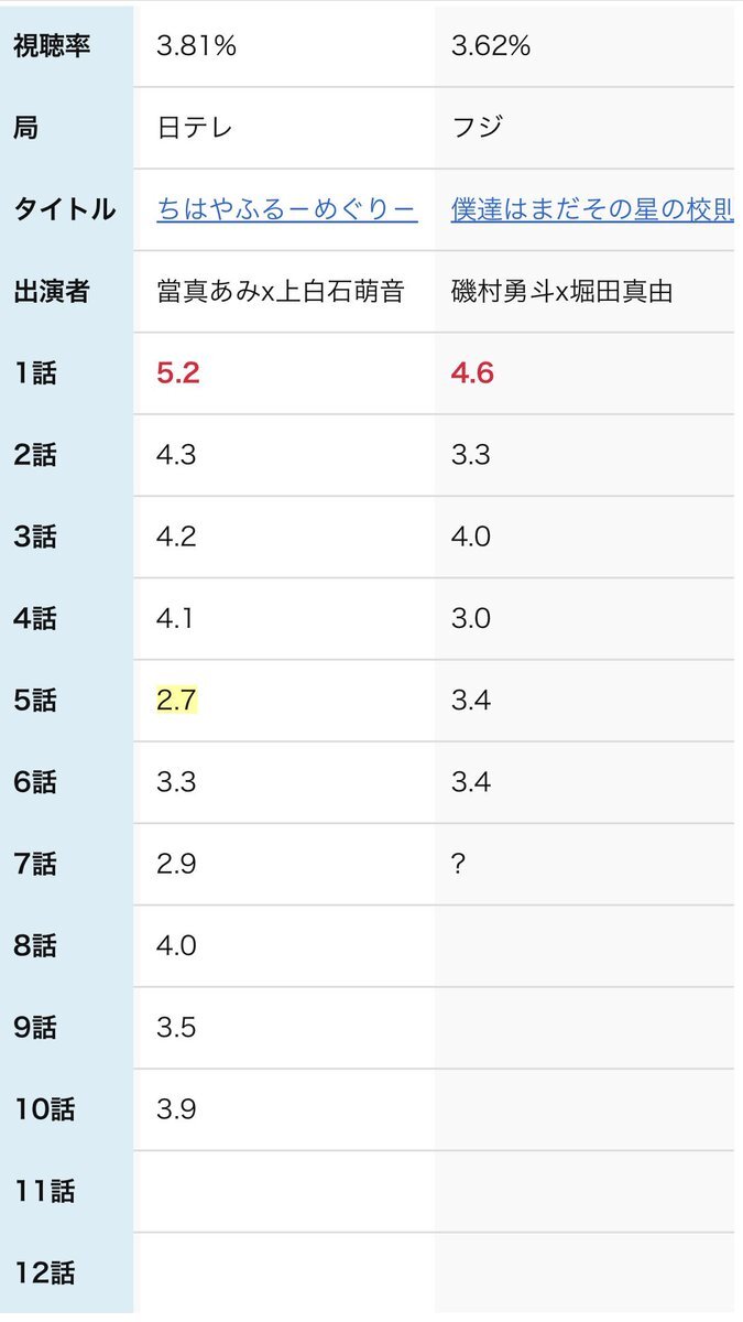今クールで唯一見てたドラマ「ちはやふる-めぐり-」 視聴率とか気にしていなかったんだけど、たまたま見たら全然視聴率取れてないのね。 ちはやふるに限った話では無くドラマ全体視聴率が取れてない。 確かにドラマって殆ど見ないよね。 pic.x.com/vN73PnMUkX