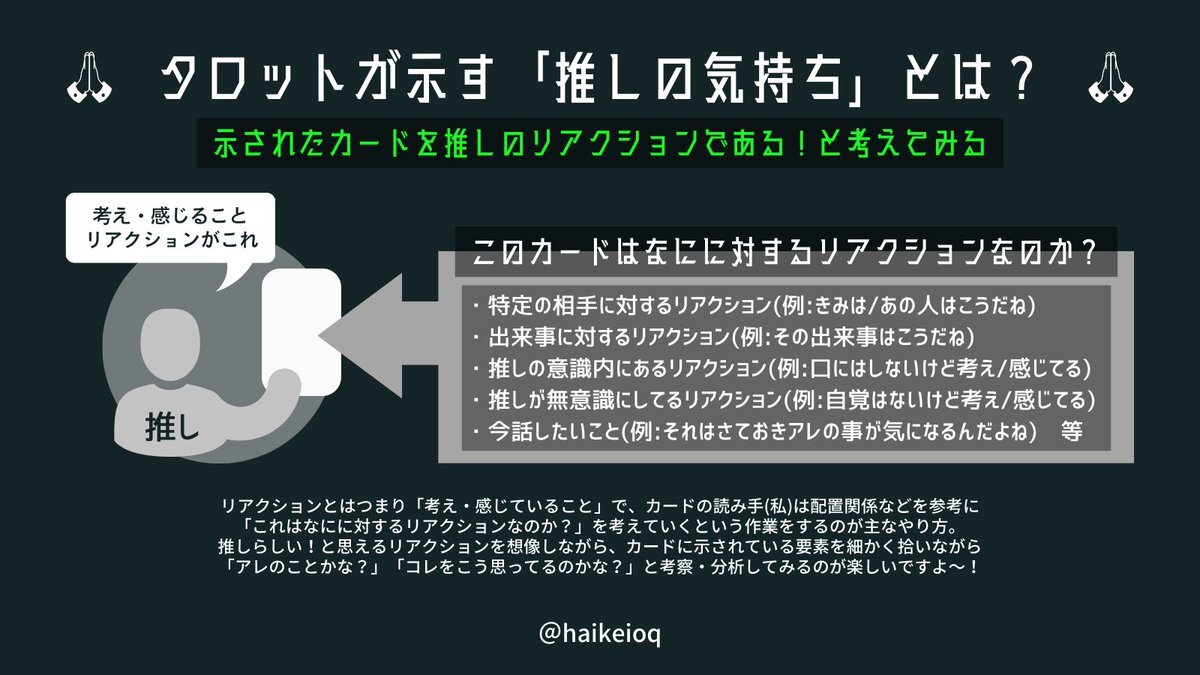 💡オタクが解説するタロットの読み方Tips 「推しキャラ・自キャラに質問してタロットを引きました」という時、そのカードをどういうリアクションとして読むか?をこんなパターンから考えてはどうでしょうか🌚 pic.x.com/IwpHUrc3iZ