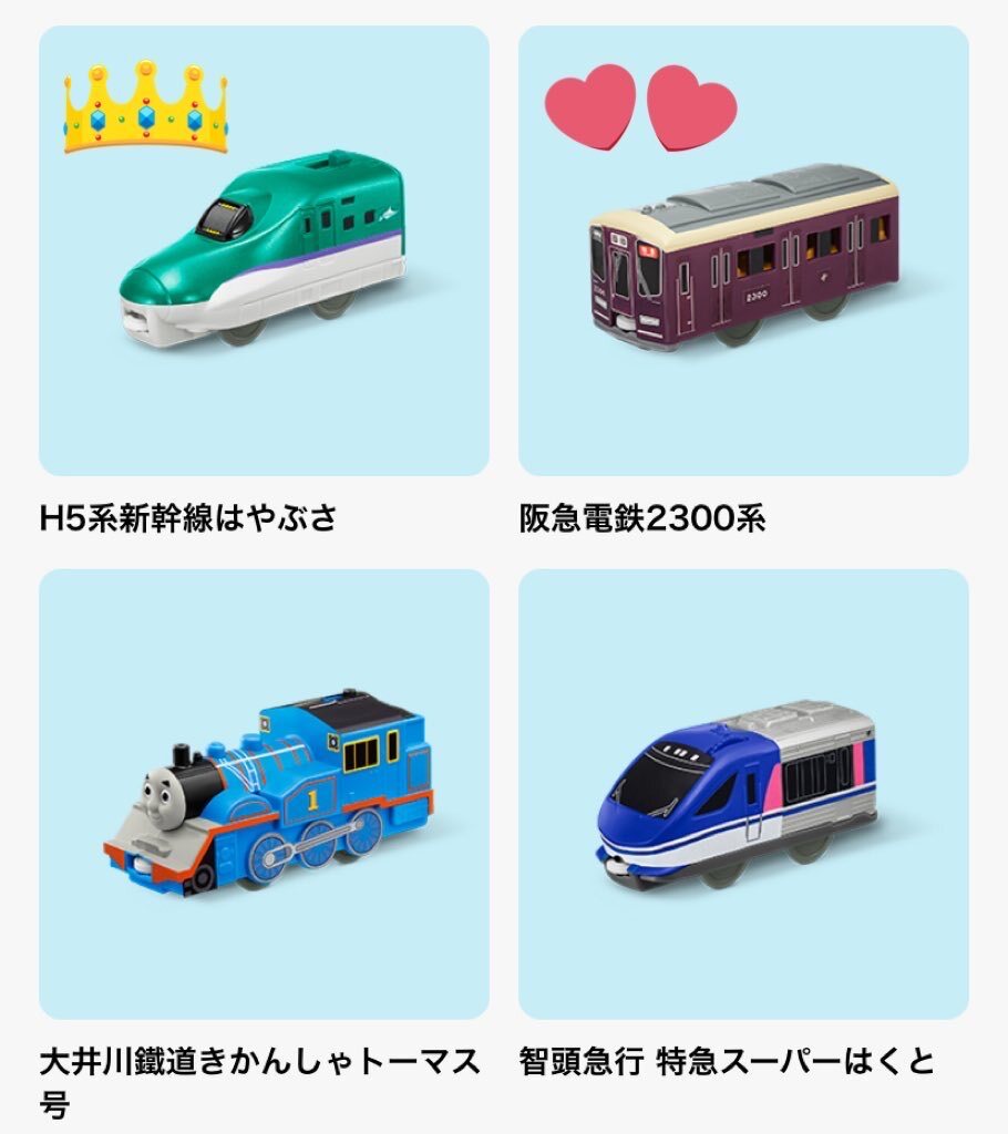 @no_TL 【交換】マクドナルド ハッピーセット プラレール 2025 【譲】👑 H5系新幹線はやぶさ×2 【求】💕 阪急電鉄2300系×2 中身確認のため蓋を開けたのみ。郵送交換希望。1つからでも可能です。検索からでもお気軽にお声かけください。よろしくお願いします。 pic.x.com/jHh1VsekPw
