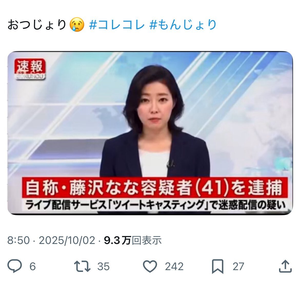 さっきのコレコレさんの朝キャス見て、もんじょり逮捕されたと本気で思ってる人は詐欺にあう素質を持ってるのでインターネットやめたほうがよろしい。