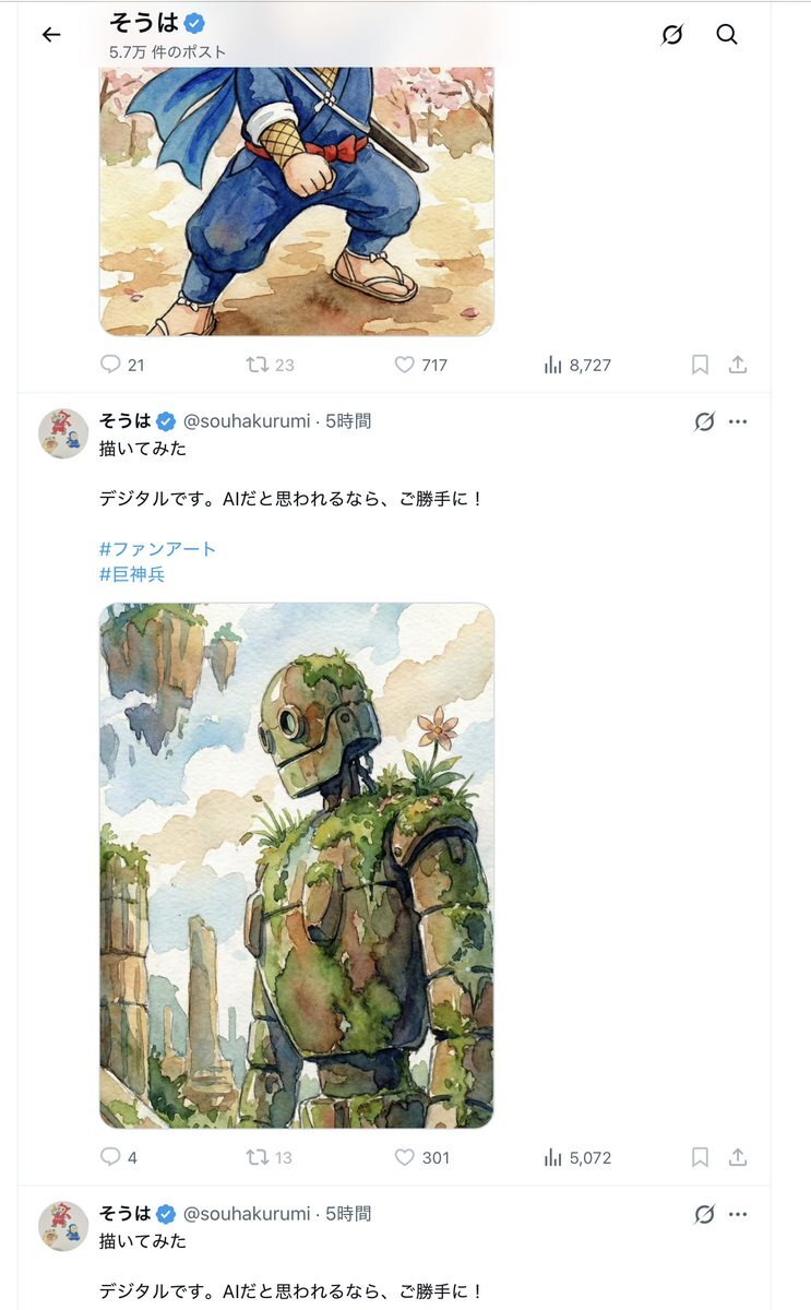 ナウシカへの造詣も深いそうはさんなら、このように独創的な顔立ちの「巨神兵」を描くことだって朝飯前なのです🥰🥰 「巨神兵」ではなくラピュタの「ロボット兵」?🤔 ファンアートなのにそんな初歩的なミスをするはずないだろ💥🫵😡