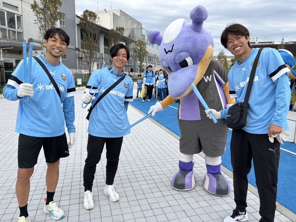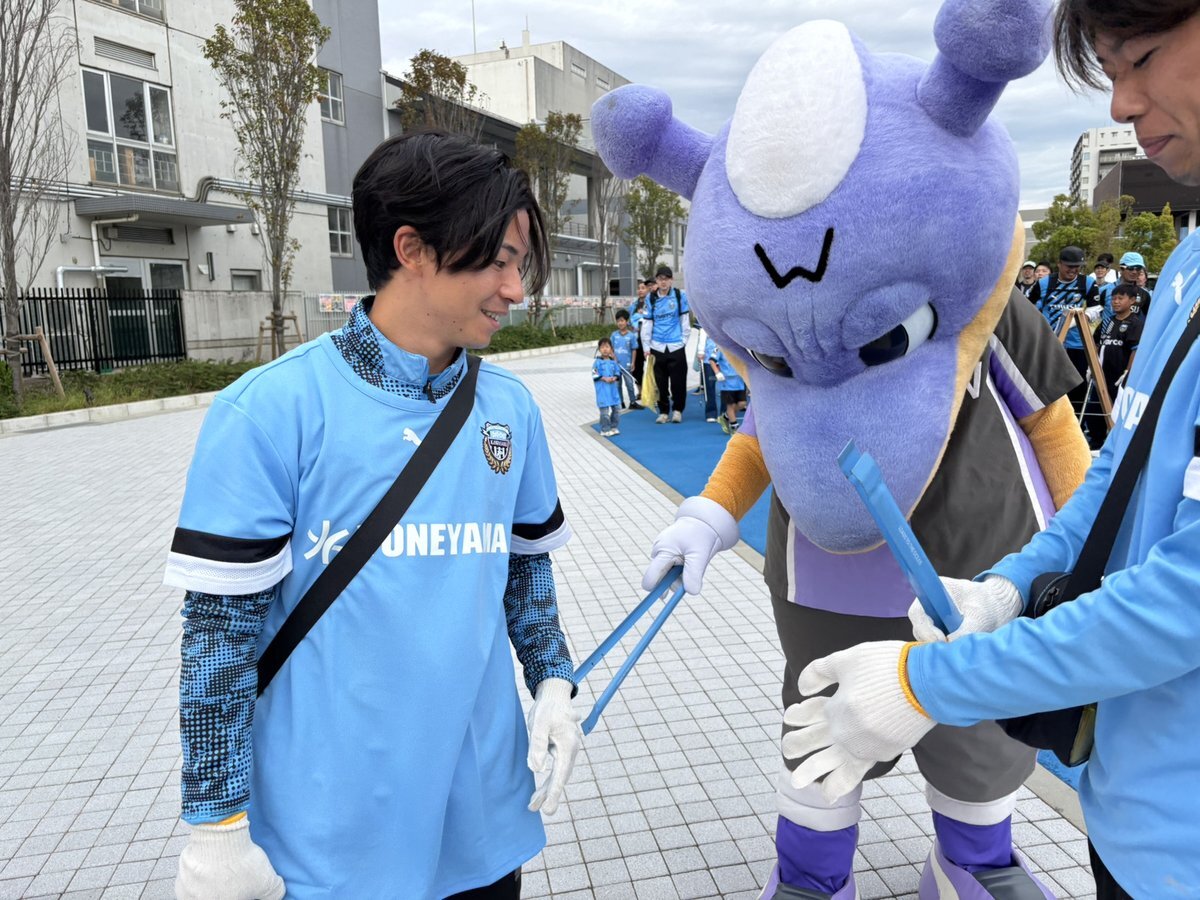 ≪富士見公園エリア清掃活動Supported by #ヨネヤマ≫ ユウ、タツ、アサヒの3人も準備万端! 3人ともいい笑顔! そしてタツ、つままれてます。 【広報】#frontale pic.x.com/zut00spLbH