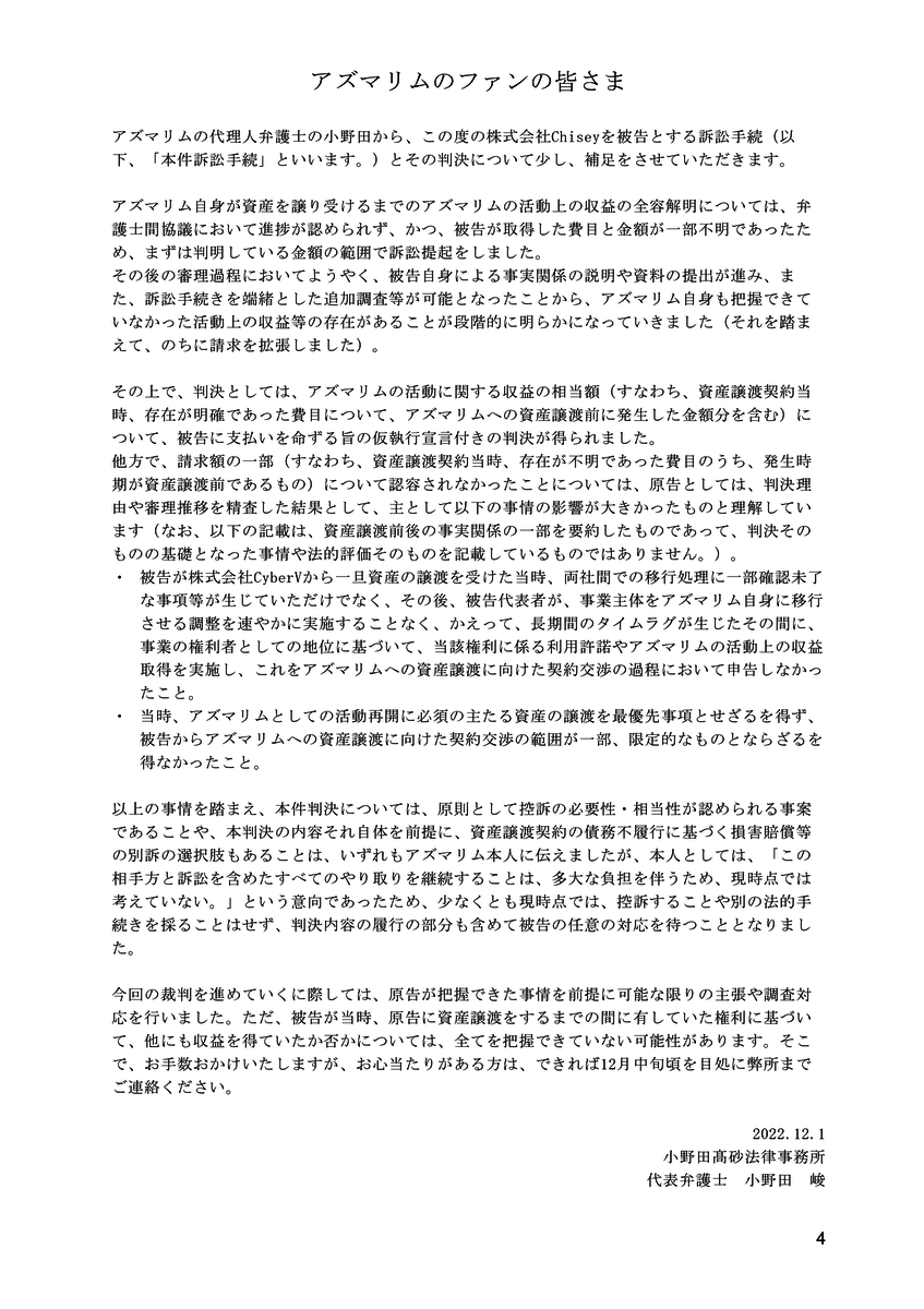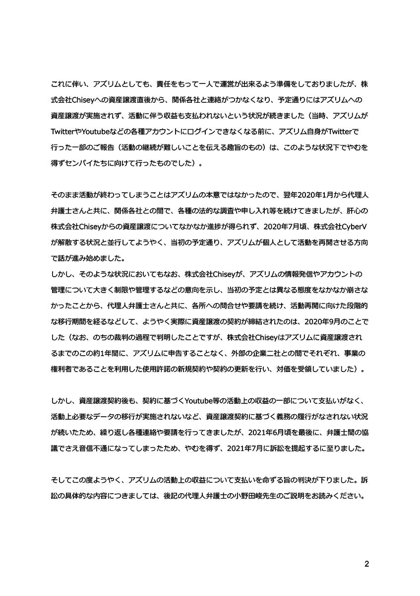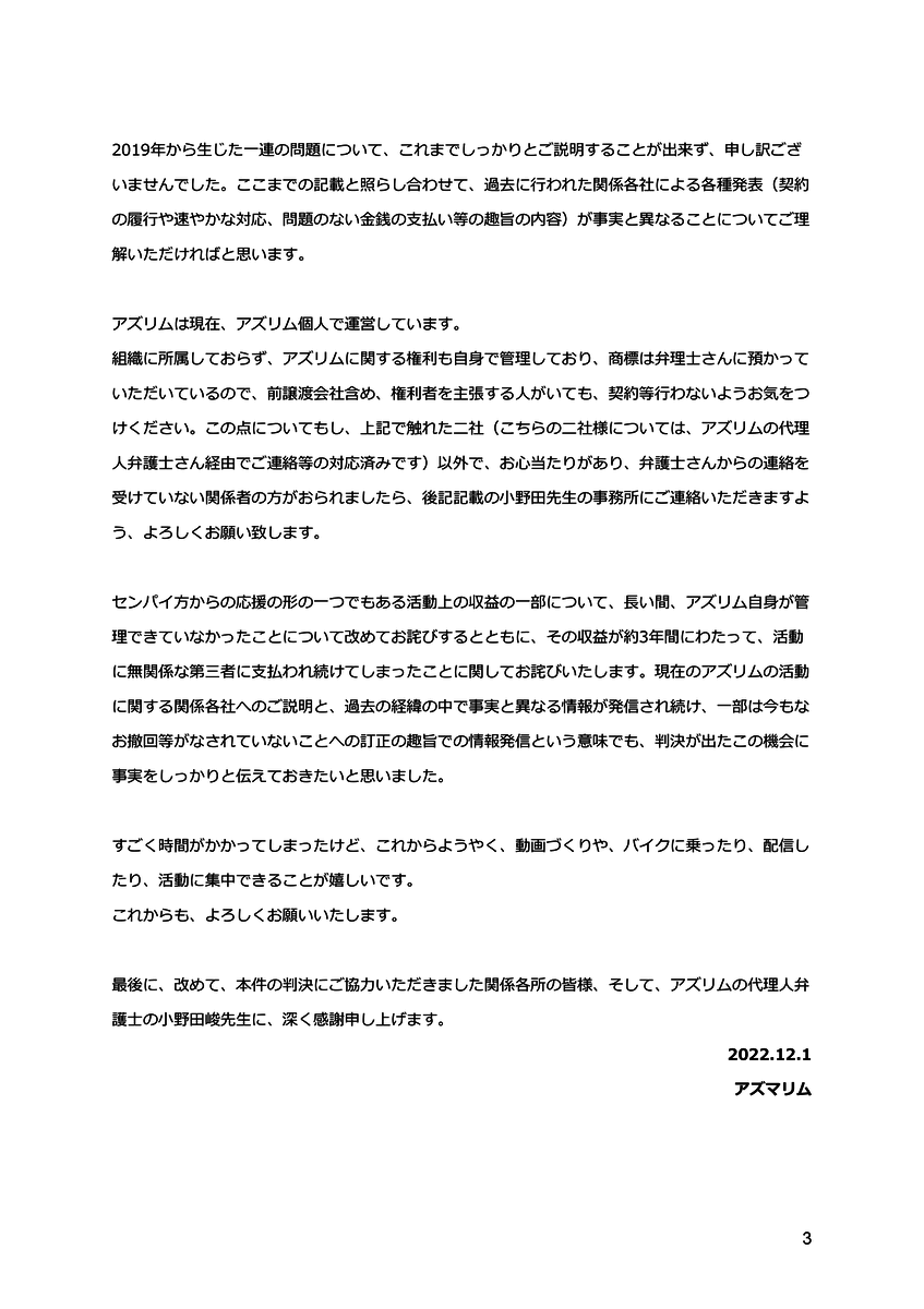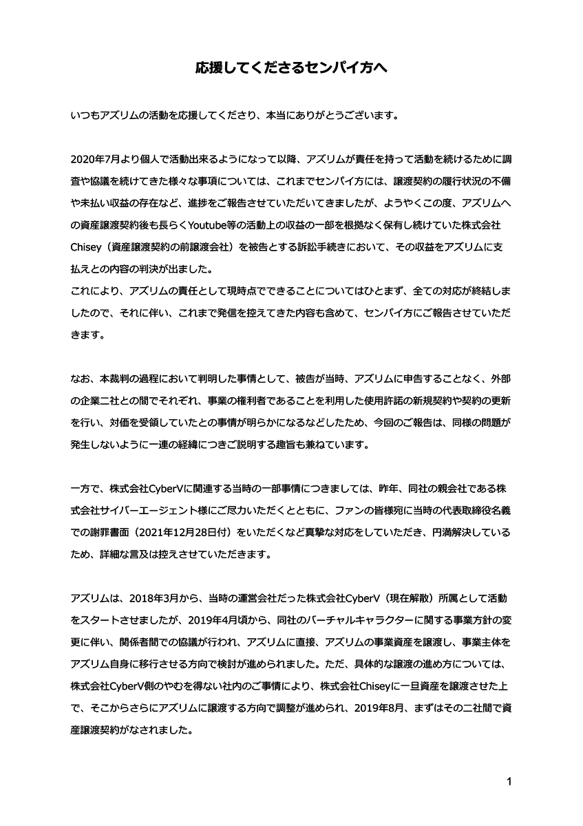【ご報告】 アズリムが個人で活動を始めた後もなおYoutube等の一部の収益が株式会社Chisey(資産譲渡の前譲渡会社)から支払われず、連絡も取れなくなった為、不当利得返還等請求訴訟を実施し支払いが認められる判決が出ました。 これに伴い、アズリムの活動に支障をきたす事態は全て終結致しました。 pic.x.com/34BszSzNPB