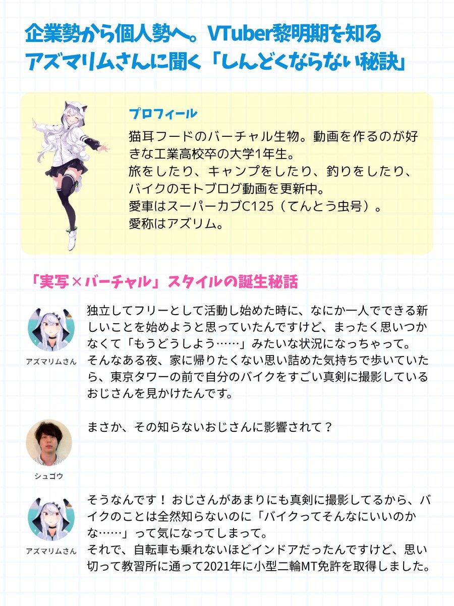 『企業勢から個人勢へ。VTuber黎明期を知るアズマリムさんに聞く「しんどくならない秘訣」』 VTuber好きのライター・シュゴウさん(@shugou17)から、アズマリムさん(@azuma_lim)へのボリュームたっぷりのインタビュー記事を公開しました🌟 記事はこちら⏬️ alive-project.com/streamer-magaz…