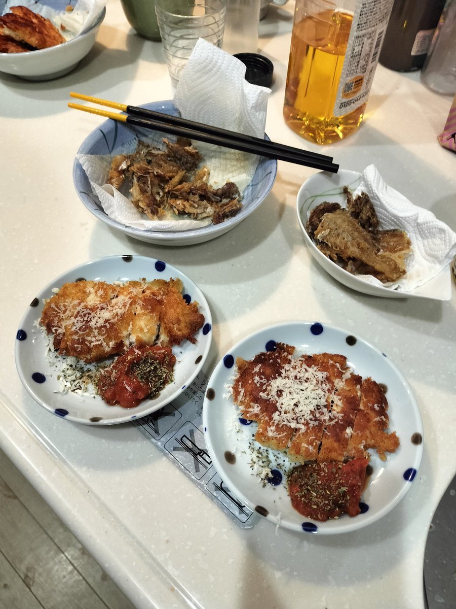 きょうの料理。アマダイの骨せんべいとミラノ風カツレツ。アマダイの骨せんべいが強烈なまでに美味しい。カツレツはおよめさんに試食してもらったところ、めちゃんこ褒めてくれました。わーい。 pic.x.com/7YVYJeiA4T