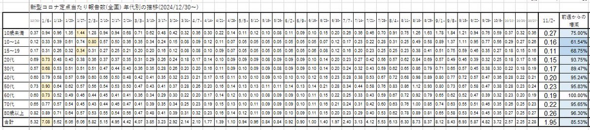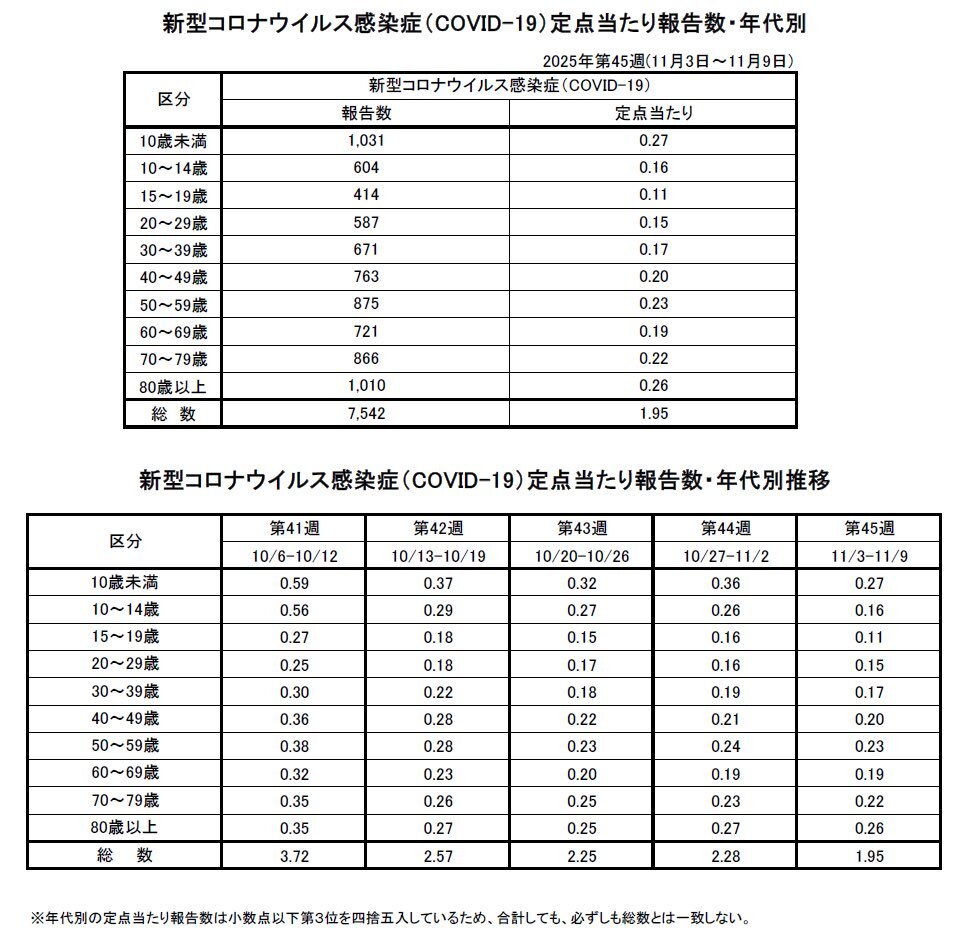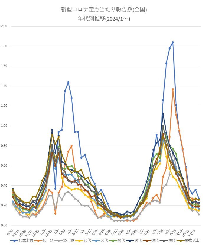 新型コロナ 定点把握 全国 11/3-9 年代別 子ども 10代前半で38%,同後半で31%,10歳未満で25%減少 おとな 一番減少した30代で減少率は11% 60代変わらずなど,ほぼ横ばい 子どもの減少が大きいので全体として減るも要注意 インフルエンザも増加し,ダブル感染に注意 次回11/10-16分は11/21に発表 (続) pic.x.com/hjtPssIvzO