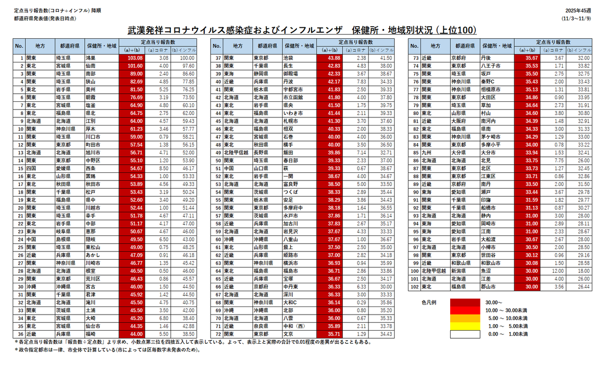 武漢コロナ・インフルエンザ 全国 2025年45週   保健所・地域別 定点当たり報告数 上位100   連結で30.00以上のエリアは102 埼玉県鴻巣管内、宮城県仙南管内は100.00超えでした pic.x.com/IFDQlwExl6