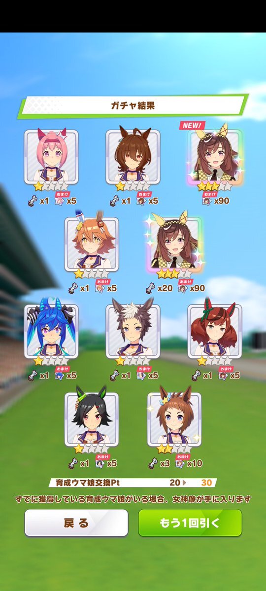 今日はウマ娘のヒキが面白い プリティーダービーは10連目✕、20連目ラインクラフトで次きそうだなとただの感覚での30連目に金→虹が2つきて両方ブエナ🐎🐎 シンデレラグレイのウエハースは4つ買ってオグリ3種とシークレット 偏りすぎじゃないか? pic.x.com/4TUu31sGIg
