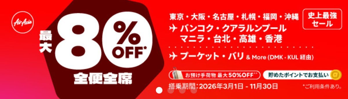 エアアジアグループ、最大80%オフの「全便全席セール」開催 - TRAICY(トライシー) 全便全席が最大80%割引となる。搭乗期間は2026年3月1日から11月30日まで、一部対象外となる日もある。また、受託手荷物も最大50%が割引となる。 traicy.com/posts/20251013…