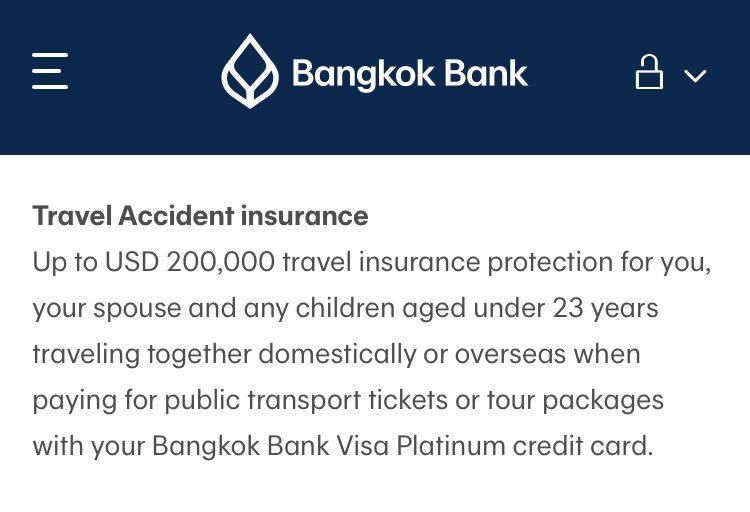 バンコク銀はクレジットカードも💩だった 日本行きの航空券、旅行保険が家族分まで付帯と書いてあったので使ってみた。その後クレーム時の手順を問い合わせると、旅行期間全体では無く、航空券買ったら飛行機事故の時だけ、電車のチケット買ったらその電車に乗ってる時の事故だけ保証されるんだって。