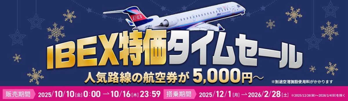 国内🇯🇵【10/10 0:00〜】🉐SALE🉐 アイベックスエアラインズがIBEX特価タイムセールを実施🌎 セール期間:10/10〜10/16 搭乗期間:12/1〜2028/2/28 ・下記片道最安値 仙台ー新千歳(札幌)5,000円 伊丹(大阪)ー福岡6,000円 中部(名古屋)ー福岡7,400円 他にも国内線対象路線多数🚀詳細公式HPへ🛩️