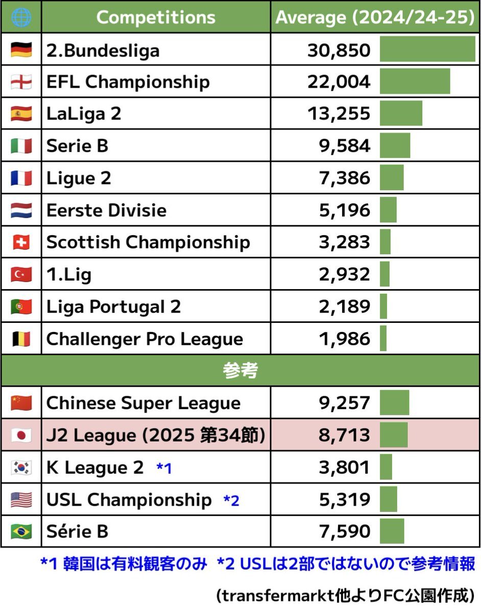 ■世界の2部リーグ平均観客数 J2の今季平均観客数はここまで8,713人。世界の中でどのぐらいの立ち意味にいるかというと…ドイツやイングランドは別格として、フランス・リーグ2を超え、イタリア・セリエBに迫る世界6番目相当(F公調べ)。つまりJ2は世界屈指の熱狂的なファンが集う2部リーグなのだ…!!