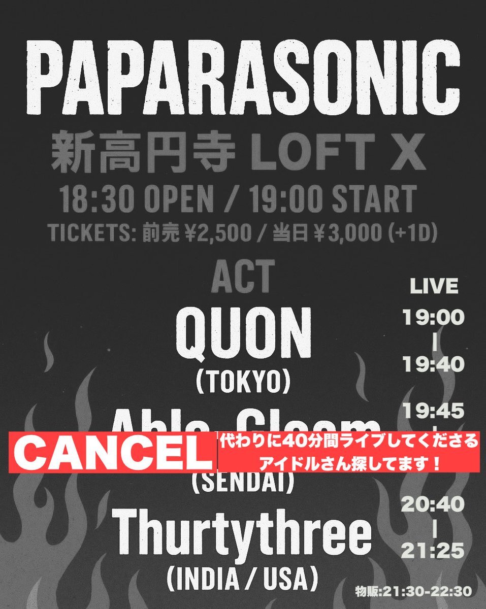 【Able-Gleam 様 キャンセルのお知らせ】 出演予定のAble-Gleam様ですが、メンバー様の体調不良により出演がキャンセルとなりました。 (お目当ての方の返金に関しましては@AbleGleam にて追ってお知らせされる予定です) つきましては x.com/quon_idol/stat…