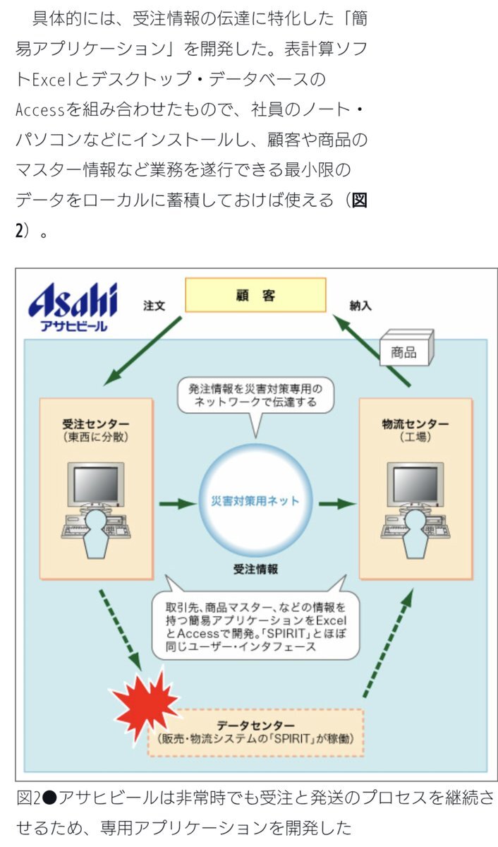 アサヒビール、もしも社内システムが死んでも「ローカルで出荷と受注だけは処理できる」システムを18年前から構築してたんですよね。事業継続計画がつよい。 【アサヒビール】社員のノートPCで基幹系を代替し、1000万円以下の投資で商品納入を継続 xtech.nikkei.com/it/article/COL…