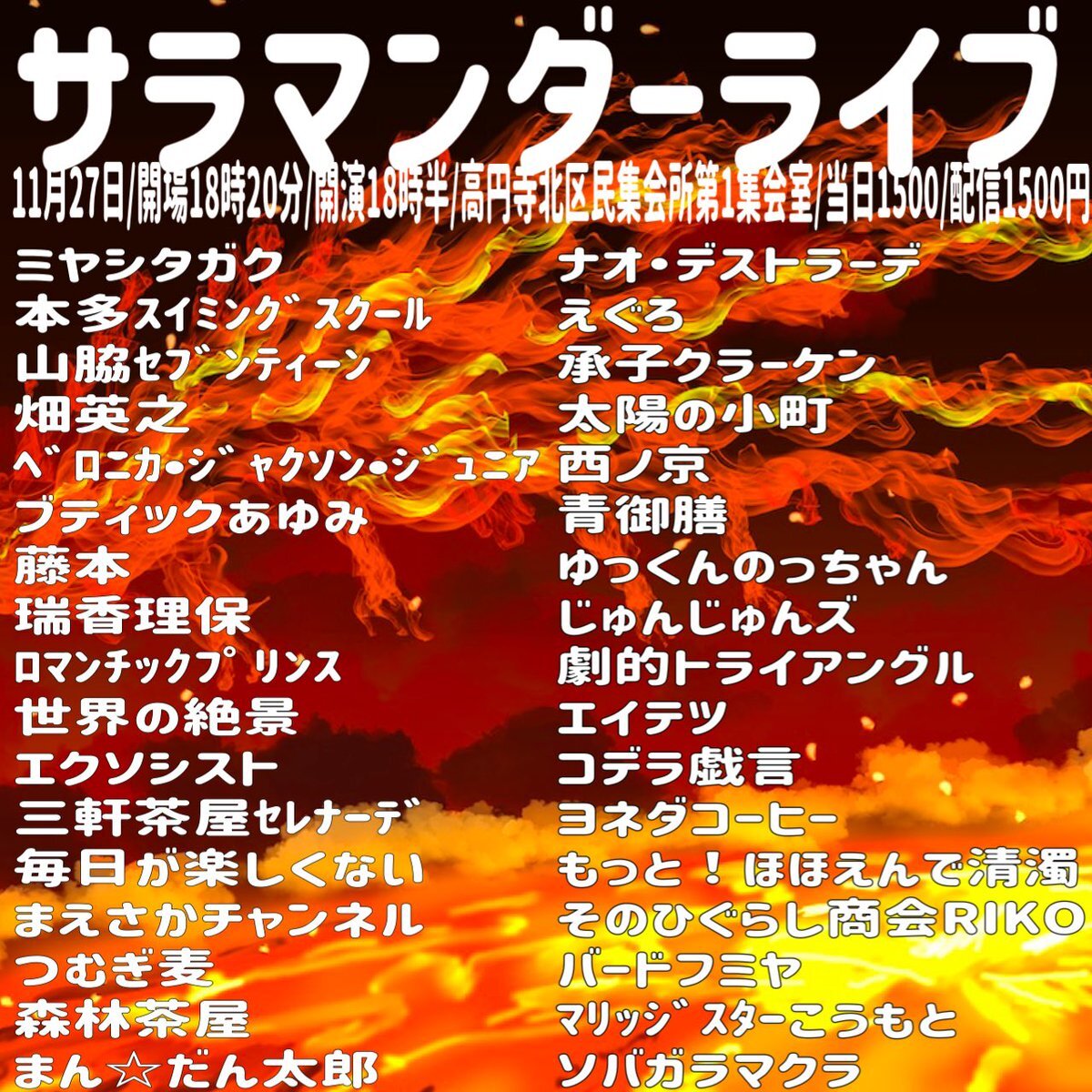 ㊗️高円寺!4日後!! 11/27サラマンダーライブ 出演① ミヤシタガク/本多スイミングスクール/山脇セブンティーン/畑英之/瑞香理保/ロマンチックプリンス/エクソシスト/三軒茶屋セレナーデ/ベロニカ•ジャクソン•ジュニア/えぐろ/世界の絶景/他 premier.twitcasting.tv/mandantaro_yos… pic.x.com/SgyVYUc0bw