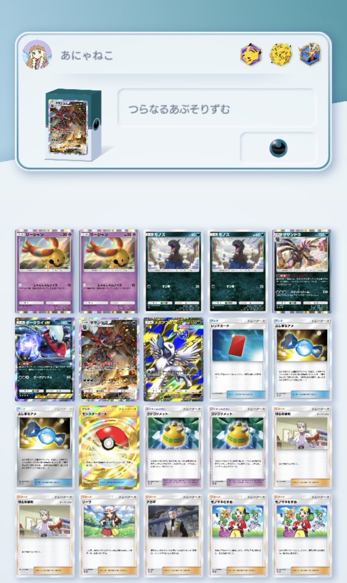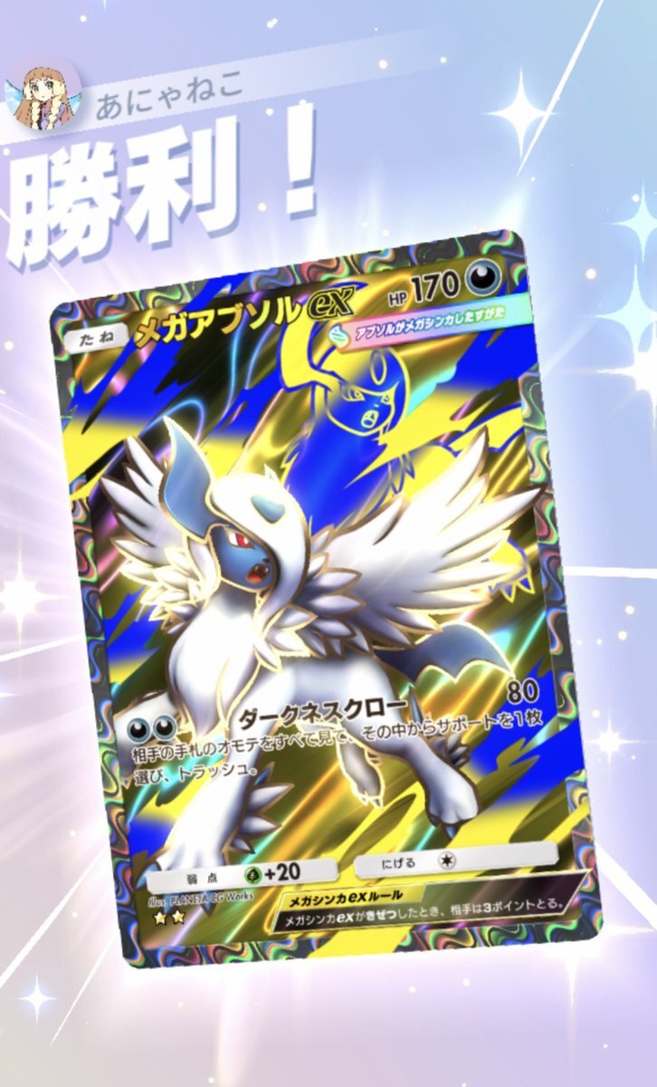 やっほー!!^ ̳>𖥦< ̳^ あにゃねこポケポケデッキ紹介の時間だよん メガアブソルexサザンドラデッキ リーシャンにはリーシャンとゴツメとダークライで対策 モノマネむすめ手札加速+レッドカード 特性エネ加速して速攻130ダメージが強い サポートトラッシュもできちゃう 楽しく遊べること間違いなし pic.x.com/f5hPHd6Vp0