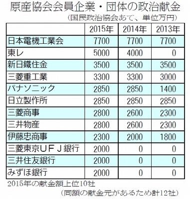 原発マネー、自民党に7.6億円 電力会社や原子力関連企業などでつくる日本原子力産業協会(原産協会、本部東京)の会員企業・団体が2015年に、自民党の政治資金団体「国民政治協会」に関連会社分を含めて少なくとも計7億6000万円献金 jcp.or.jp/akahata/aik16/…