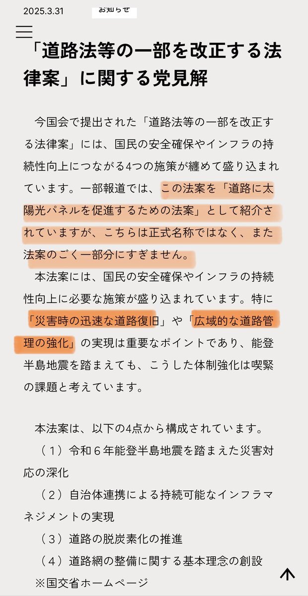 太陽光パネルについて「参政党は推進法案に賛成しただろ!」との声をいただきますが、そのような法案は存在しません。 ご指摘の対象は「道路法等の一部を改正する法律案」であり、党の立場はこちらで説明しております👇 sanseito.jp/news/n2335/ 正確な情報に基づく議論を大切にしてまいります。 x.com/rina_yoshikawa…