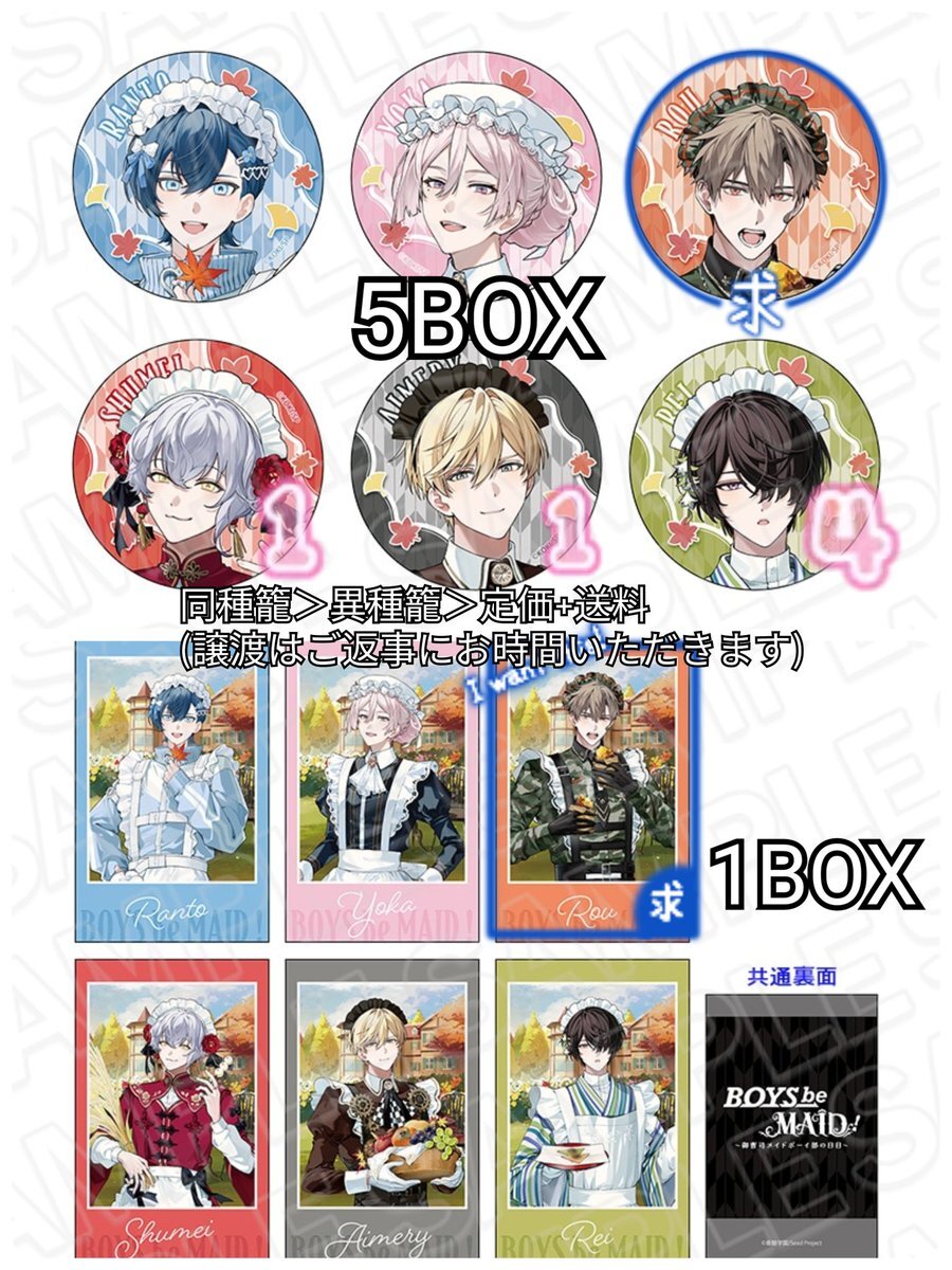 【交換】 BOYS be MAID! ビーメイ 交換 AGF 事後通販 [譲]蘭士 籠 秋明 エメリ ①AGF缶バッジ(+通販分各5) ②初期缶,グリ缶 ③CD特典丸缶 ④CD特典スクエア缶 ⑤AGFフォト風カード ⑥過去弾フォト風カード [求]余花 ①:同種 ②:同種(制服>メイド) または異種(①) ③:異種のみ ④,⑤,⑥:同種 ↓ pic.x.com/UIeRLtNEcG